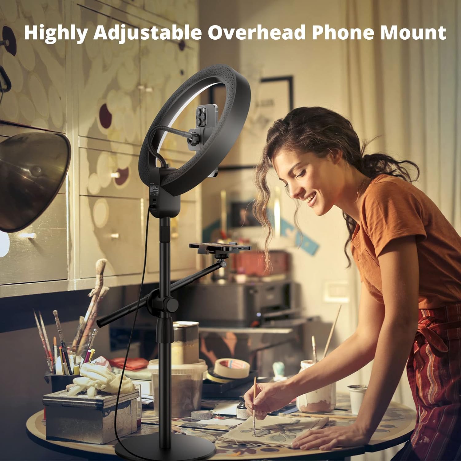 - 【Dual Phone Holders for Multipurpose & Overhead Recording】Dual cellphone holders are compatible with 3.5”-6.7” cellphones, offering perfect angles for both desktop and vertical shooting as well as close glare-free lighting. This ring light stand is a perfect solution to live streaming, and a super convenient content creation kit for cooking, handmade video, hand account creating, drawing, make-up video, nail art video, etc.