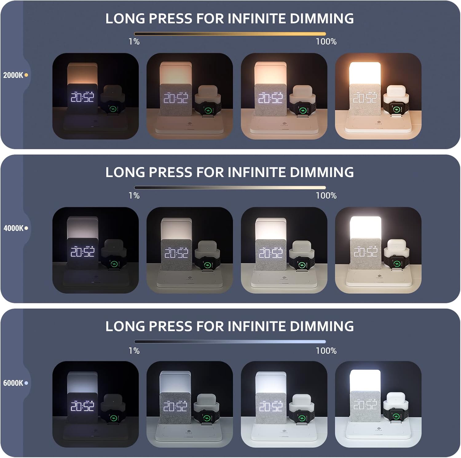 - [Adjustable Upgraded Clock and Lamp] Using smart chip and Built-in battery gives the alarm clock memory function. The alarm clock display has 3 kinds of brightness that can be adjusted and turn off. Don't bother your sleep. Night lights has three color modes(white, warm white, warm) and adjustable brightness (10%-100%). Soft and flicker-free protect your eyes.