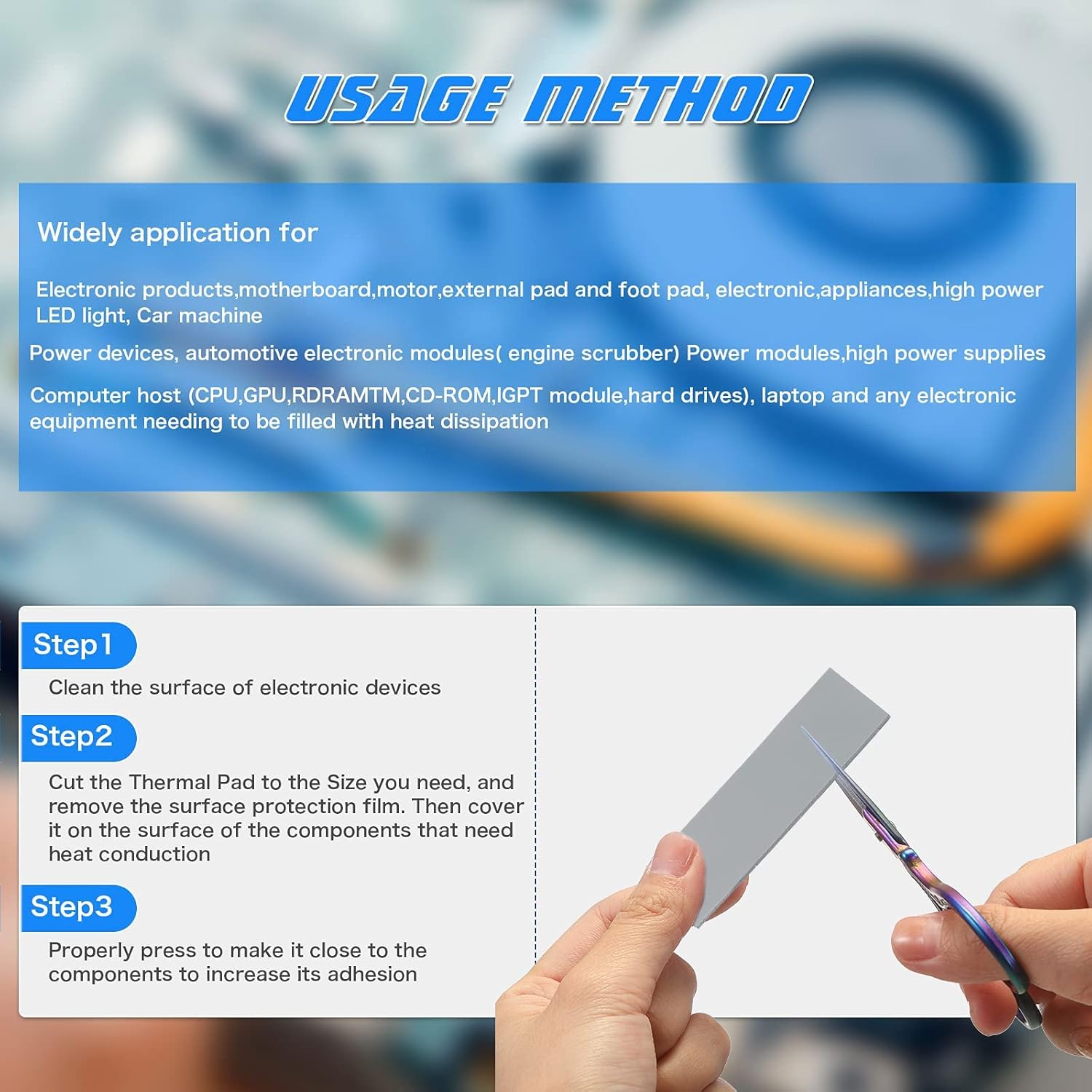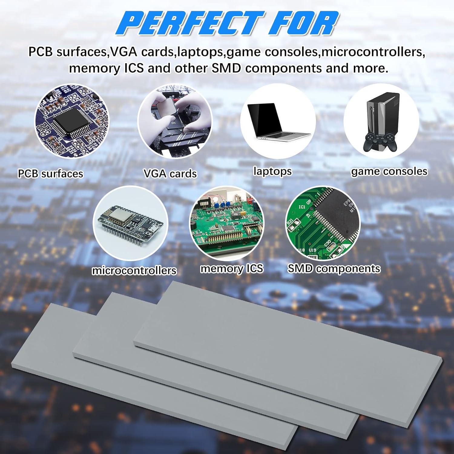 - Thermal Conductivity: quality thermal silica gel material with 6.0 walt/ thermal conductivity, our thermal pad nicely improve the heat transfer between the electronic elements and effectively cool the temperature down in seconds