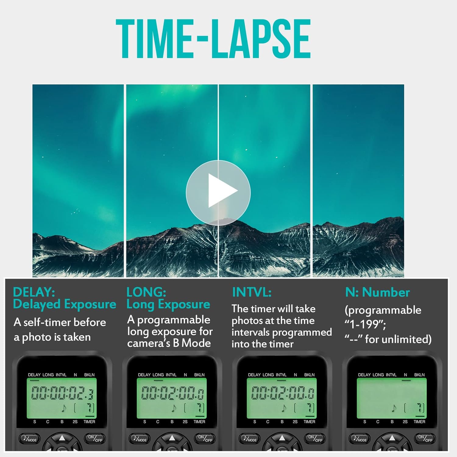 - With LCD screen, you can set the function you want, and the display is easy to understand. Under timer mode, delay exposure, long exposure, interval, exposure number function can be programmed together, this timer intervalometer great for time-lapse recording of blooming flowers, astrophotography, etc.