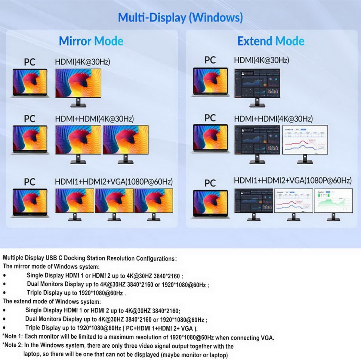 - 【12 IN 1 USB-C Laptop Docking Station】 This multiport USB C adapter to dual HDMI, HDMI 1 and HDMI 2 single port up to 4Kx2K @30Hz/3840x2160, dual display up to 1920x1080@60Hz, or triple displays up to 1600x900@60Hz; VGA port up to1080P@60Hz, 3 x USB 3.0(Up to 5Gbps), USB C 3.0, 100W PD3.0, Fast Ethernet up to 100Mbps, SD/TF, 3.5mm Audio Jack【 Note】ONLY when your devices support 4K resolution, the video output will be 4K. Please make sure to use a HDMI 2.0 cable or better.