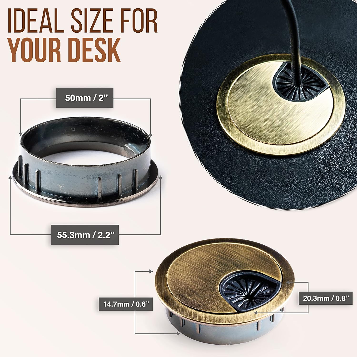 - Easy Installation: These Metal cable desk wire hole inserts are easy to install into 2 inch / 50mm hole in your desk.Simply trace outer diameter of cord grommet to drill hole and push metallic grommet in it