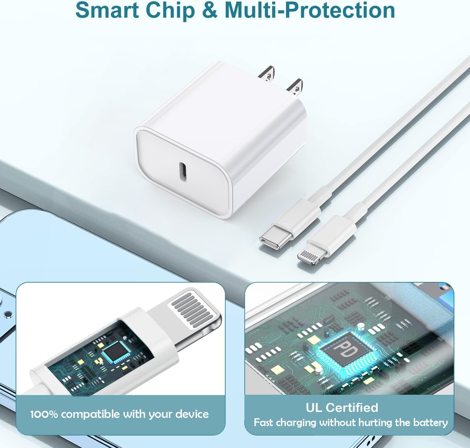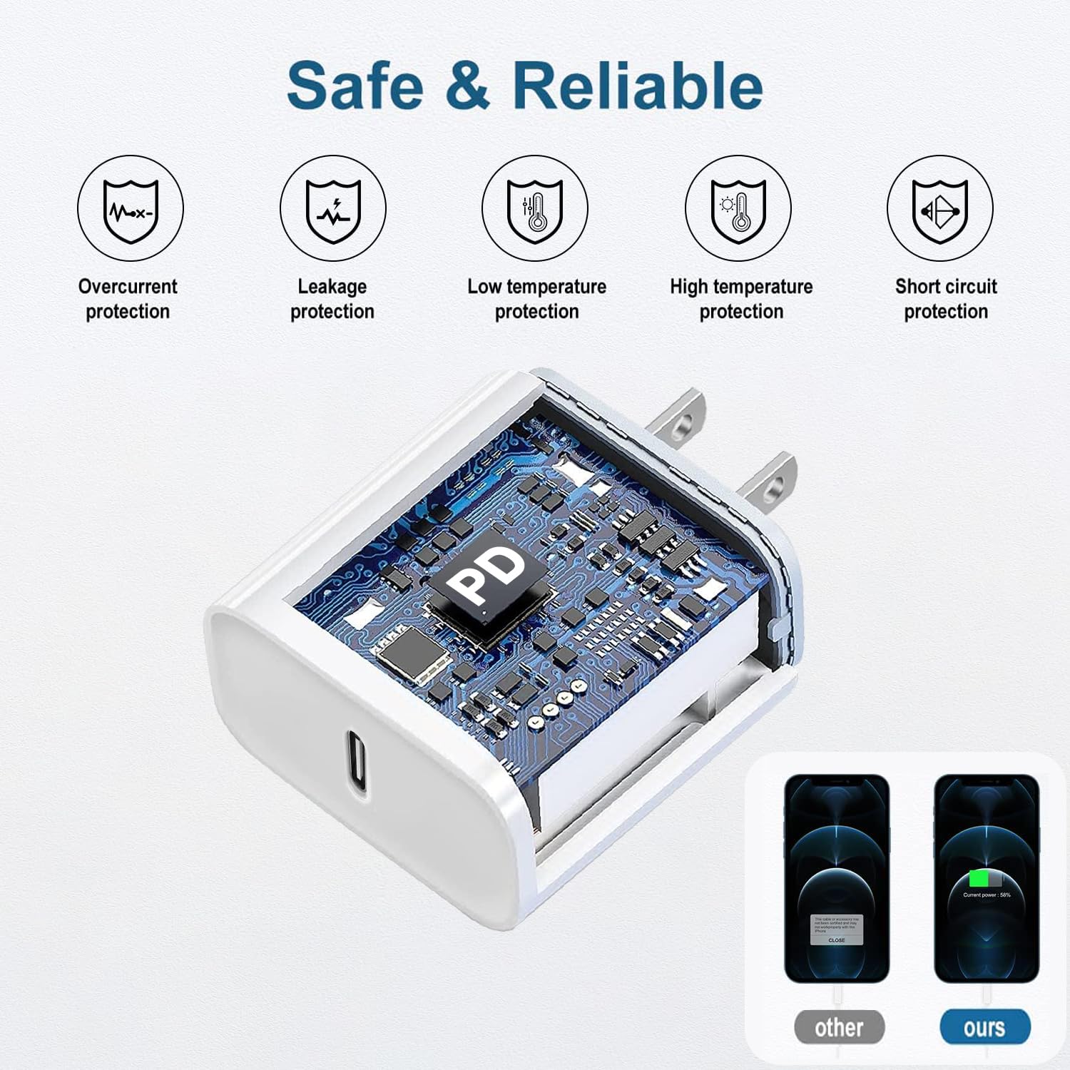 - 【Comprehensive Safety Protection】These fast iPhone chargers passed ETL(US),FCC,CE,UL certificated, which match the U.S. and World electrical standard. Shell is made of sturdy ABS material, insured heat resistance and low temperature resistance, chemical resistance and excellent electrical properties.The charger internal High-quality smart chips can protect your devices from over-heating, short-circuiting and over-charging.