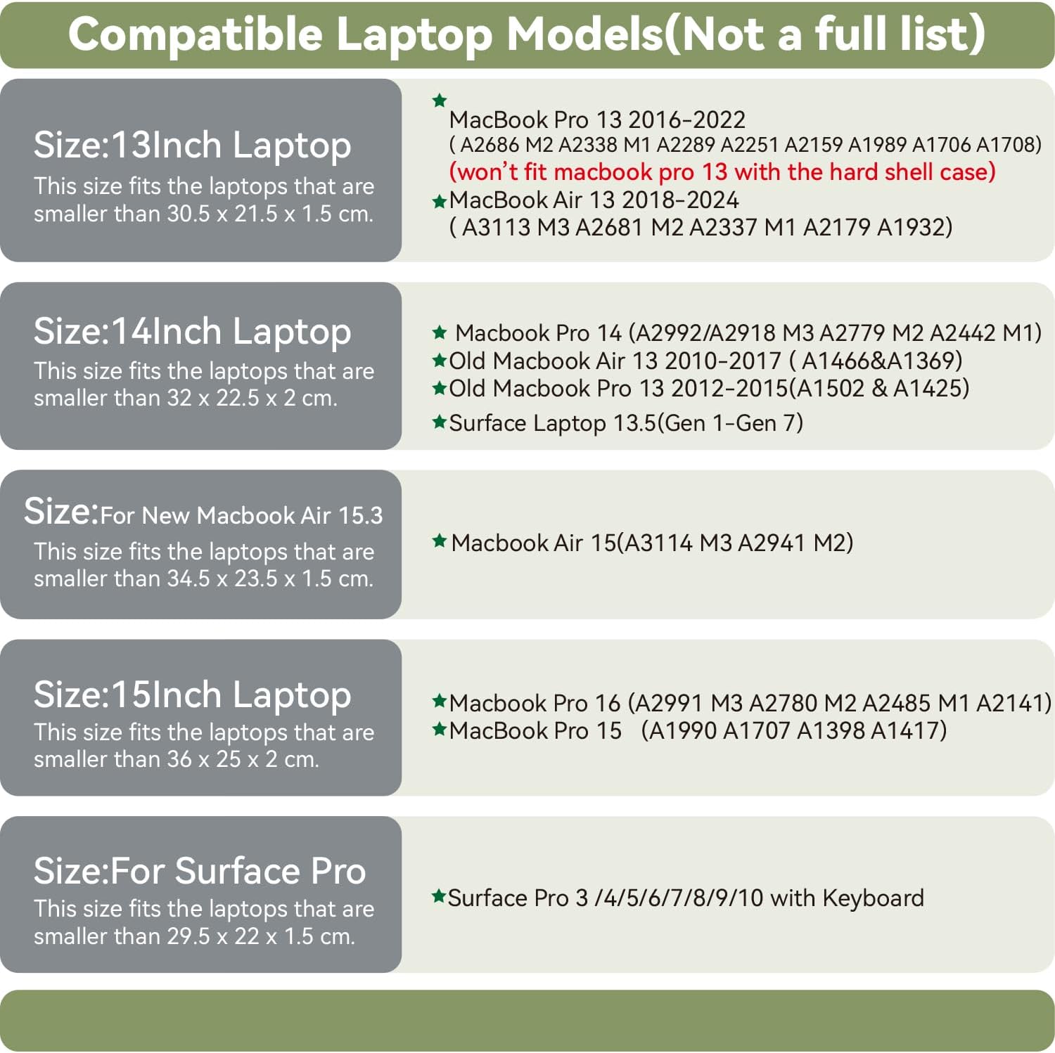 - Perfect Size: Our laptop sleeve is compatible with New MacBook Pro 13 2016-2022 ( A2686 M2 A2338 M1 A2289 A2251 A2159 A1989 A1706 A1708), New MacBook Air 13 2018-2024 ( A3113 M3 A2681 M2 A2337 M1 A2179 A1932).Other laptops that are smaller than these dimensions-30.5x21.5x1.5 cm.If your laptops are too small than the above dimensions,then the sleeve will be a loose fit.If one of your laptop's width,depth or height is larger ,then pls consider the next size