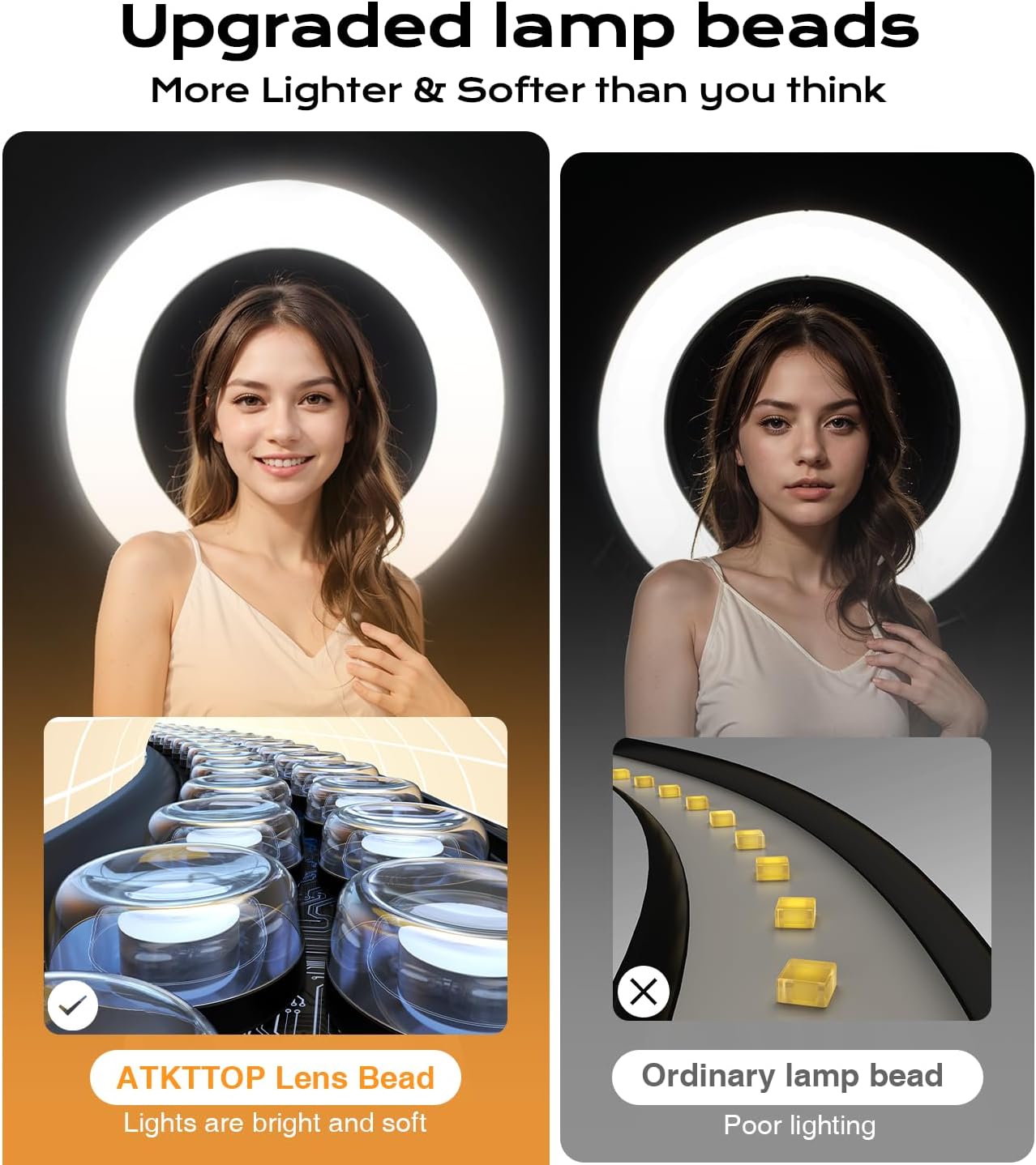 - 【Dimmable Ring Light with Stand】Overhead tripod for iPhone equipped with 3 color modes, ranging from warm 3000K to white 6000K, and a wide range of brightness from 10% to 100%.ATKTTOP iPhone camera stand uses high-cost PMMA lens beads to reflect the light back and forth across the range to produce a softer light that protects your eyes during the creative process. High-quality photography is possible even in dimly lit environments.