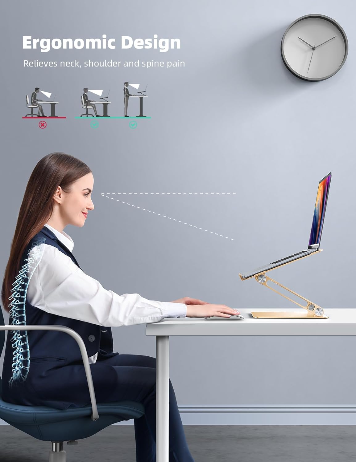 - Ergonomic Design: The MacBook air pro stand holder works as a raiser to elevate the laptop screen to your eye level. The office computer stand let you fix posture and relieves neck, shoulder and spinal pain, it's very comfortable for working at home, office and outdoor, make typing more easier.