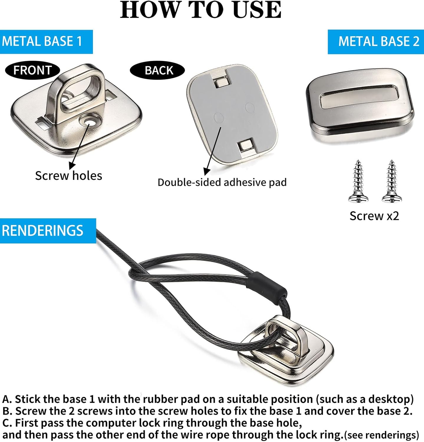 - 【High Quality】Made of high quality metal material, resistant to wear and aging. Reusable and long life. High strength adhesive, the security base can be securely attached to your electronics when the tape is removed. Easily lock your laptop, tablet or other device.