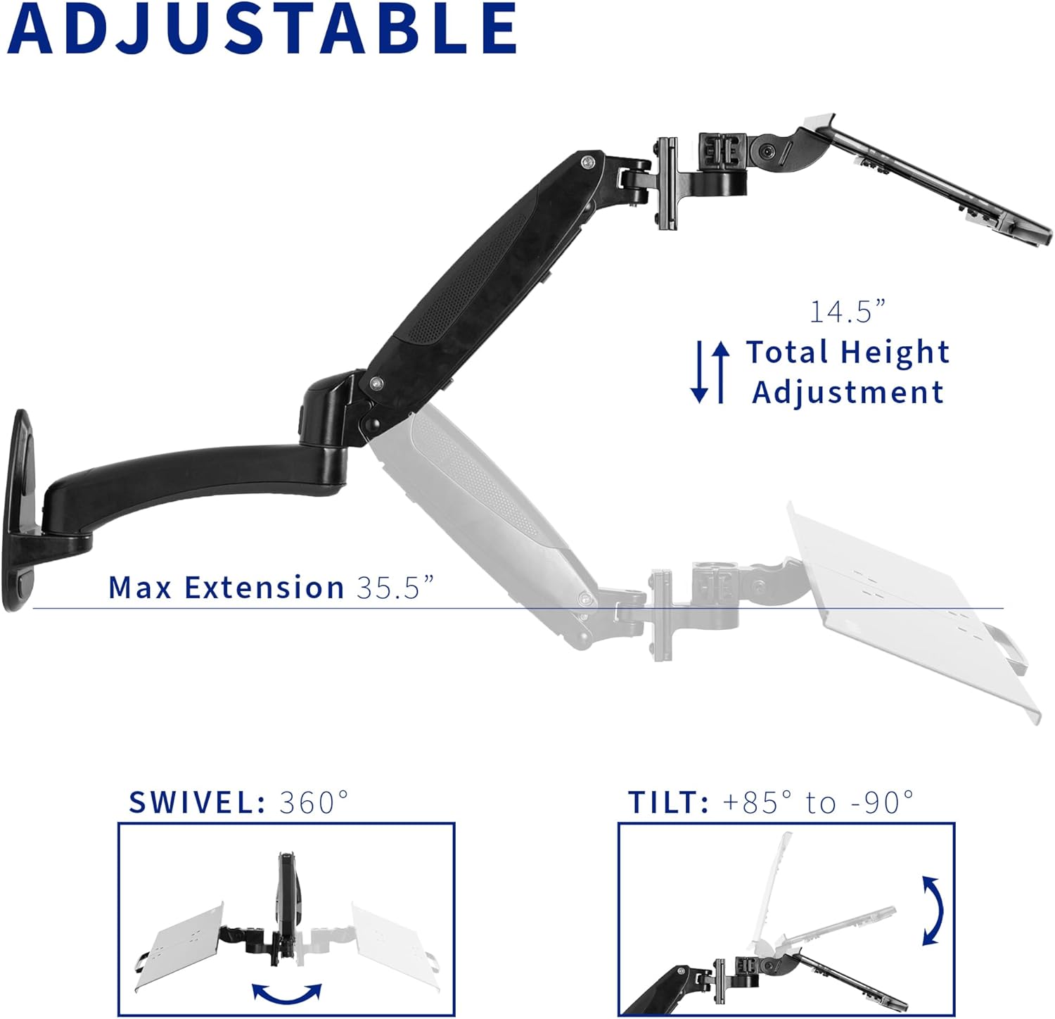 - Great for Floating Workstations - Adjustable wall-mounted 23.6" x 7" keyboard tray is the perfect addition to a wall monitor mount (sold separately) to create a floating workstation for quick standing access. The tray extends a total of 35.5" from the wall, creating an easily accessible platform for your keyboard and mouse.