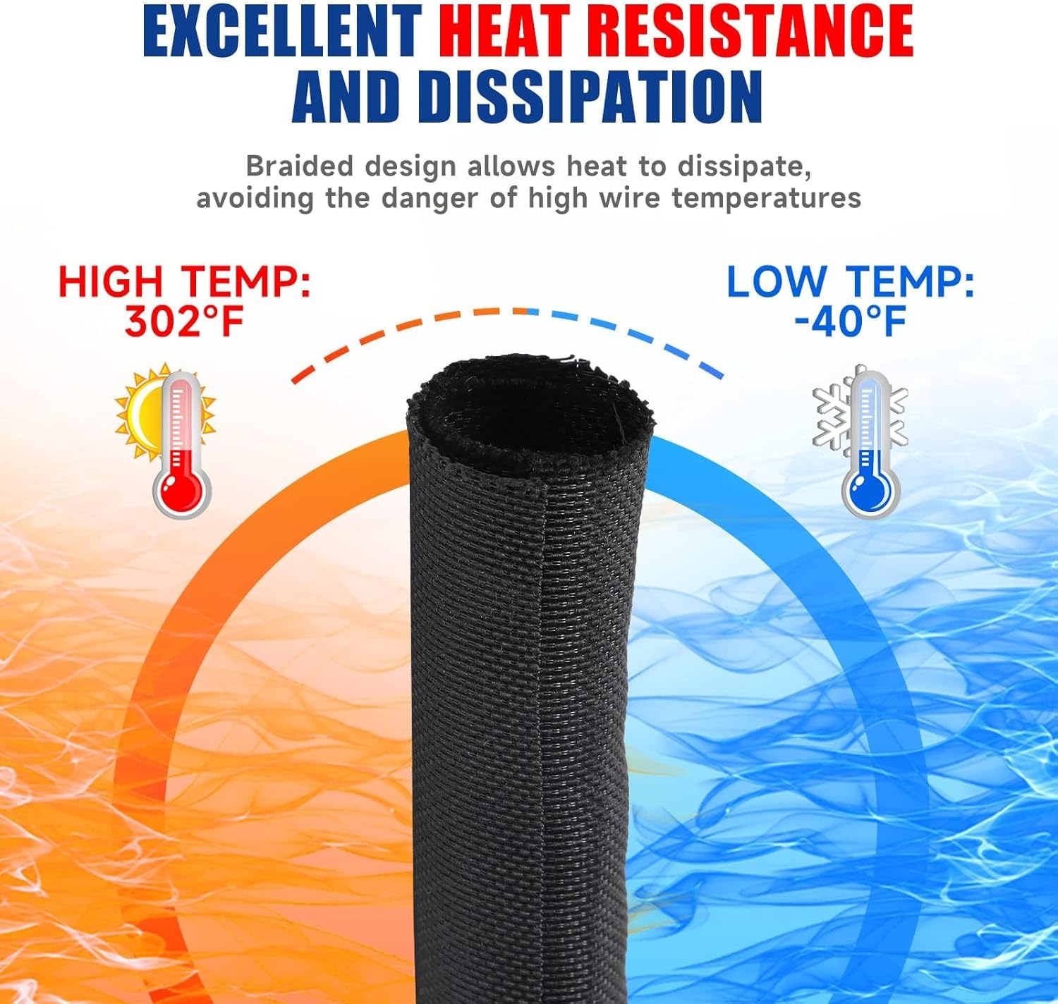 - Excellent Heat Resistance and Dissipation:Braided design allows heat to dissipate,avoiding the danger of high wire temperatures;automotive wire split sleeving made from Heat-retardant Woven Polymer Material;Heat Resistant to 302 degrees F;High temp automotive wire sheathing provides a high temperature protective sleeve for the harness significantly extending the life span of your cables
