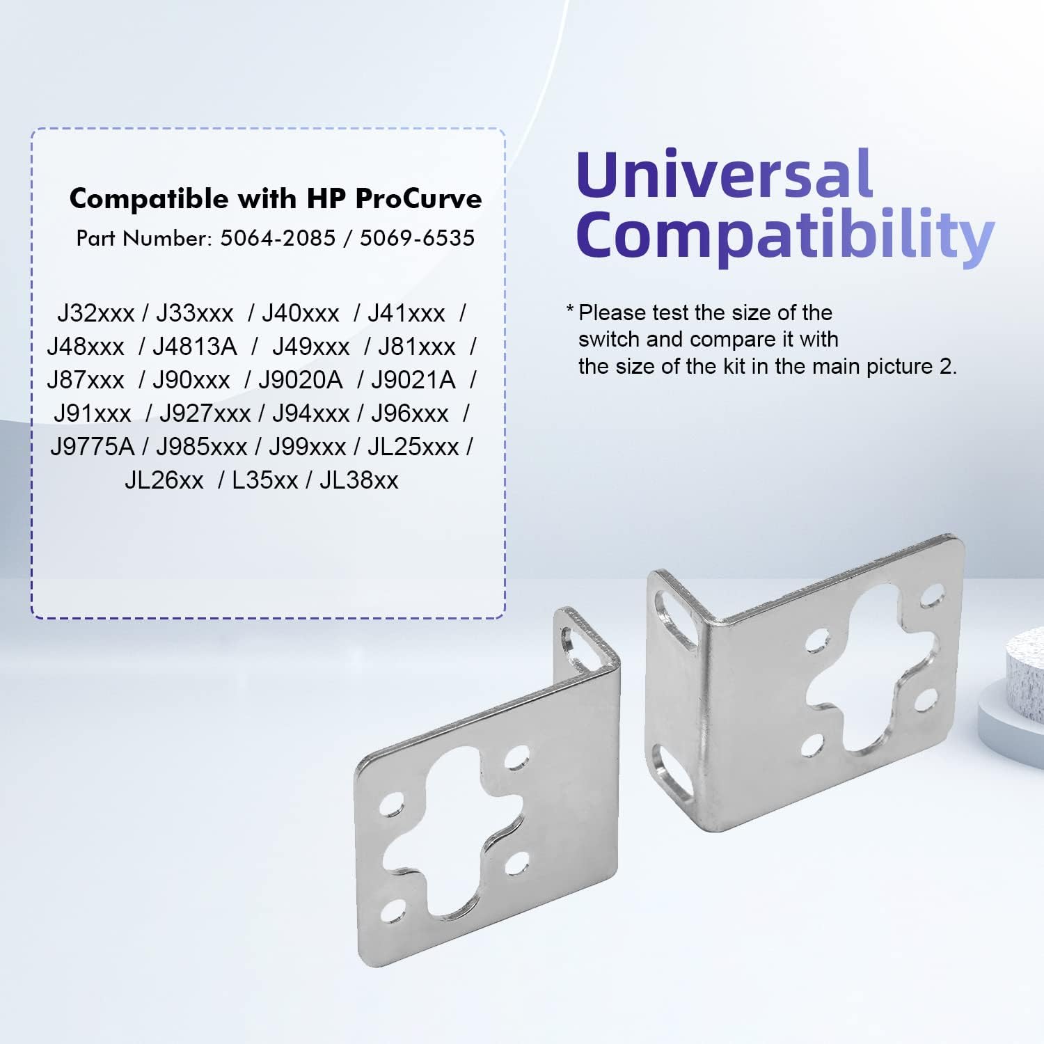 - 【Compatible For HP Switches】The rack mount kit is compatible for HP ProCurve/Aruba/OfficeConnect/HPE HP-4S (5064-2085) (5069-6535) series switches. Please check the compatibility model list before purchasing to ensure this rack ear is compatible with your switch.