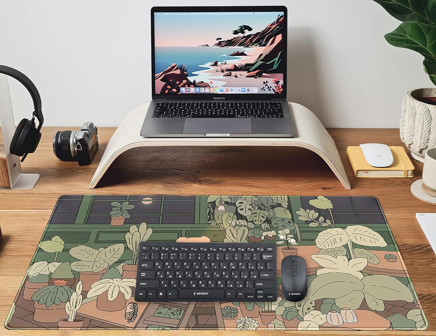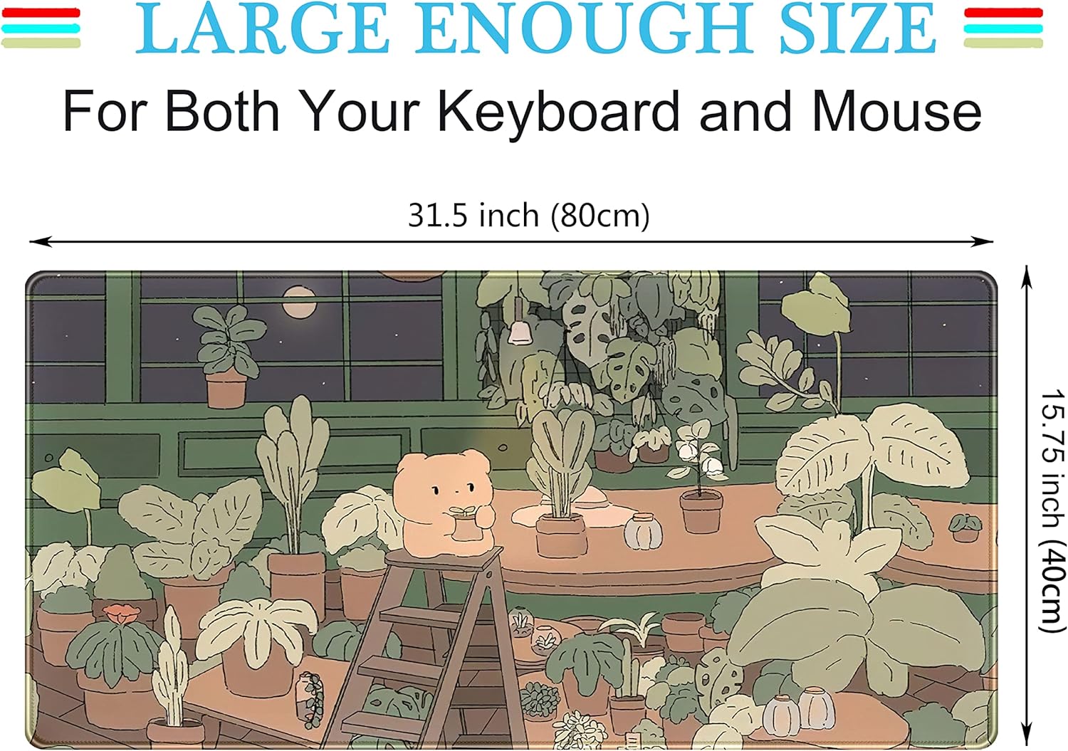 Cute Desk Mat Kawaii Bear Mousepad Cute Anime Plant Desk Protector, Kawai Aesthetic Brown and Green Forest Keyboard Mat, Large Mouse Pad XXL Gaming Desk Pad XL Office Home Decor for Women Girls