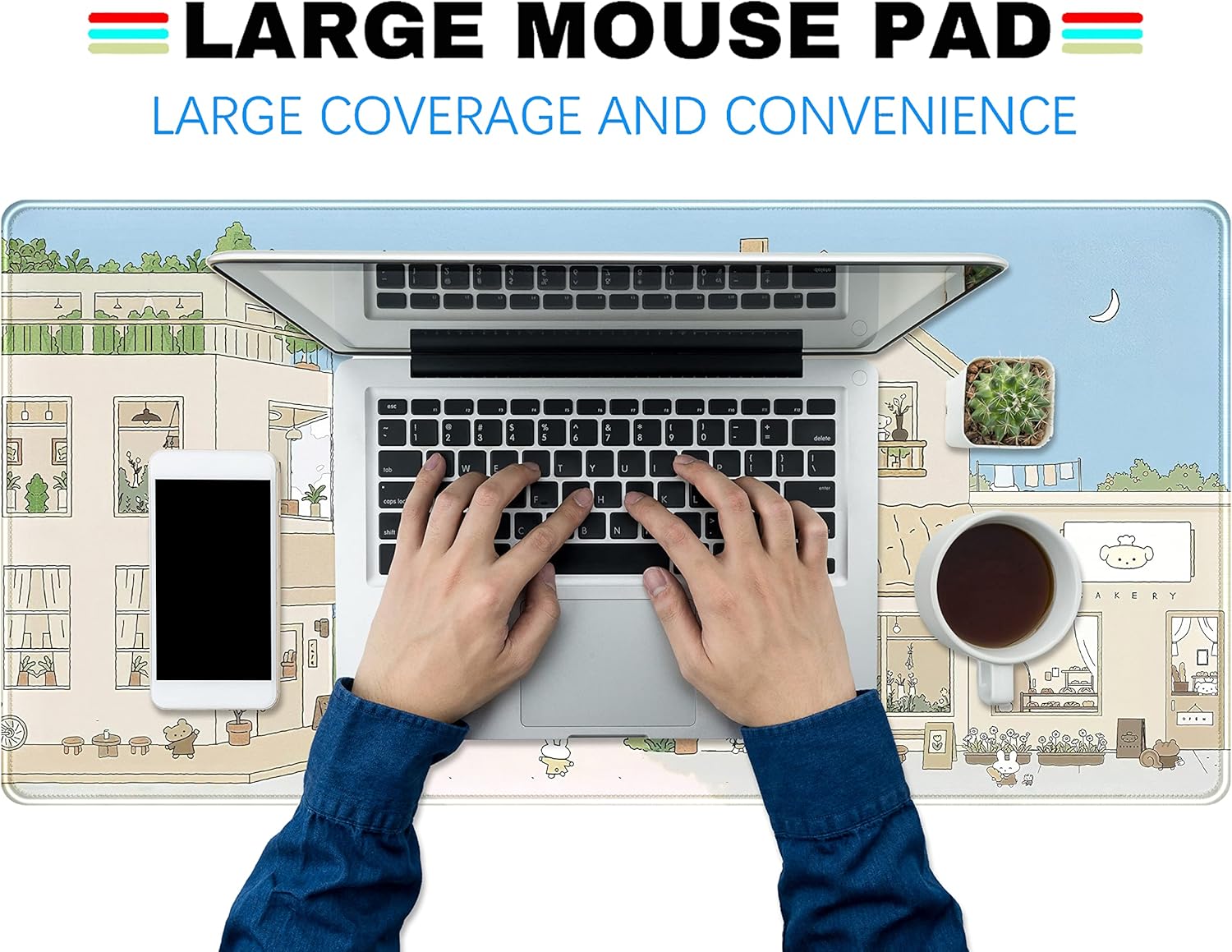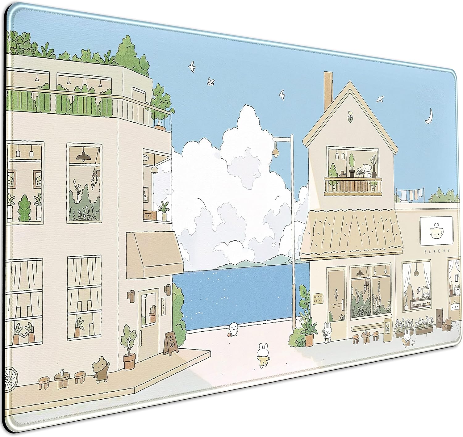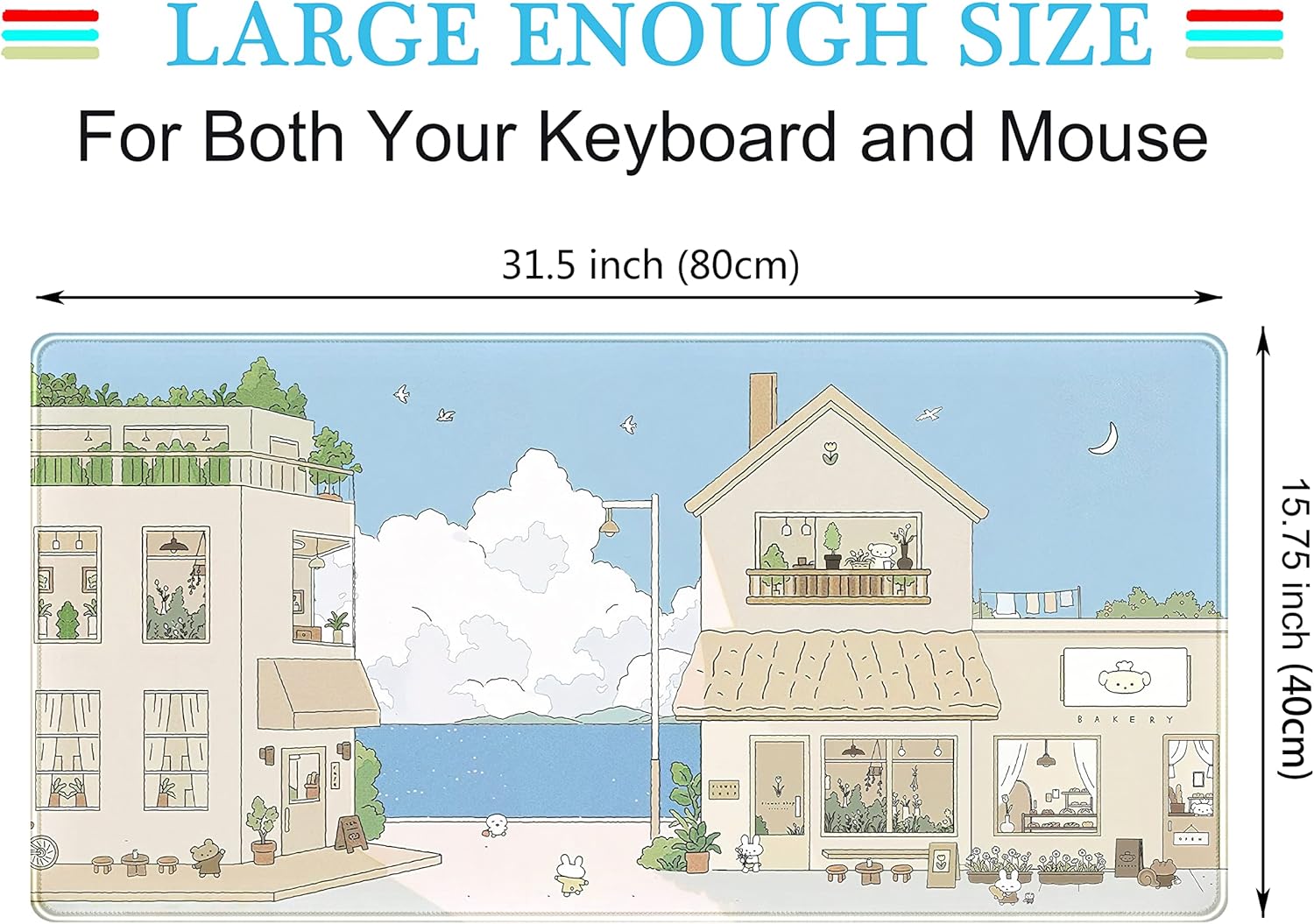 Cute Desk Mat Kawaii Mousepad Japanese Street Mouse Pad, Blue and Brown Cute Anime Keyboard Mat 31.5"x15.75", Large Mouse Pad XXL Gaming Desk Pad XL Office Decor for Women Girls Laptop Keyboard Pad