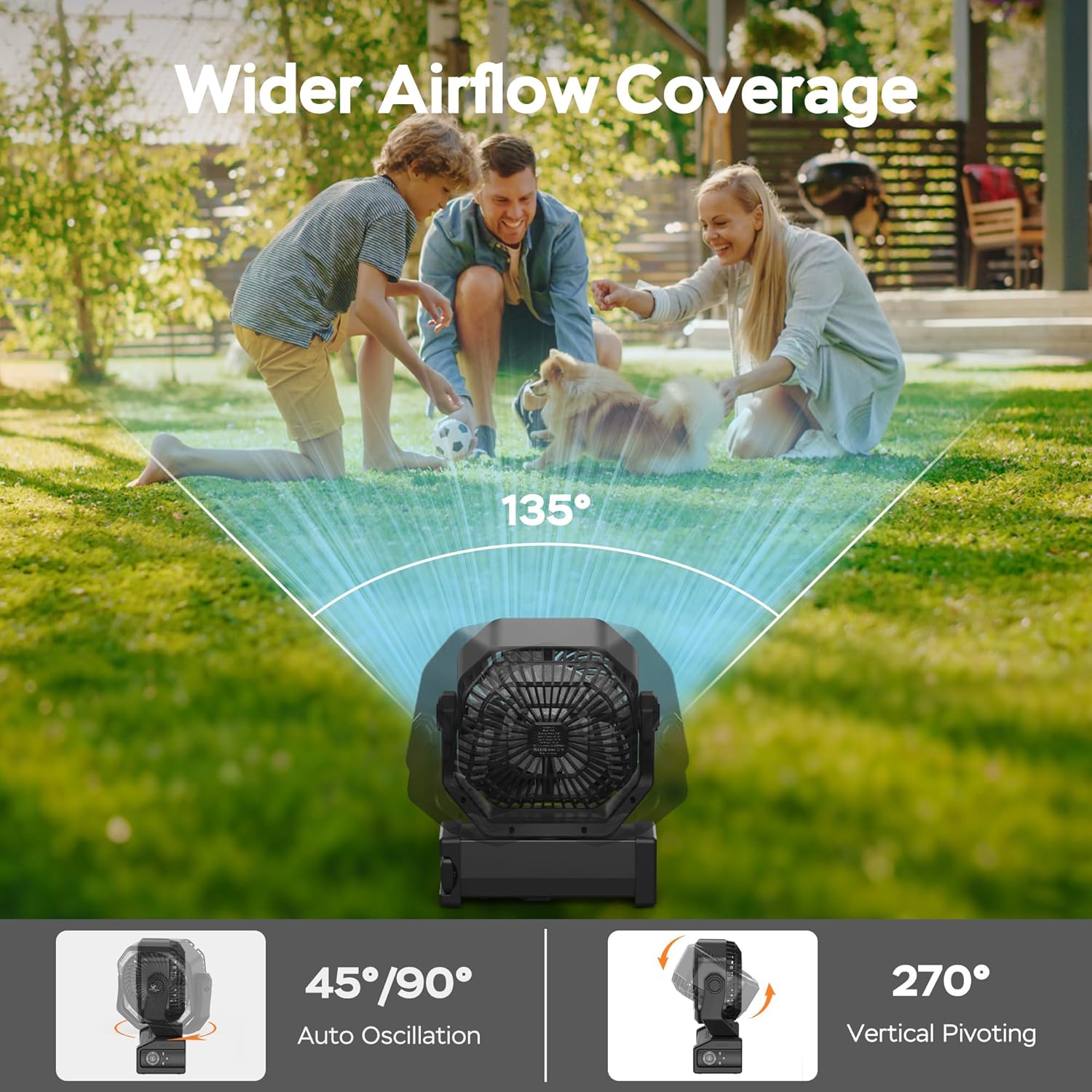 KITWLEMEN Camping Fan with Light - 20000mAh Rechargeable Battery Fan, 60Hrs Max Run Time, 4 Speeds, Timer, Auto Oscillation, 270° Pivot & Hook for Camping, Power Outage, Hurricane