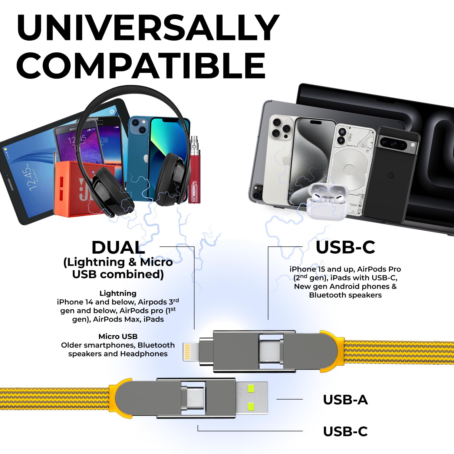 Rolling Square InCharge XL 200cm - USB C Charger Cable, Lightning Cable for Smartphone, Universal Cable Charger 6 in 1, USB Plug, Yellow, 100W
