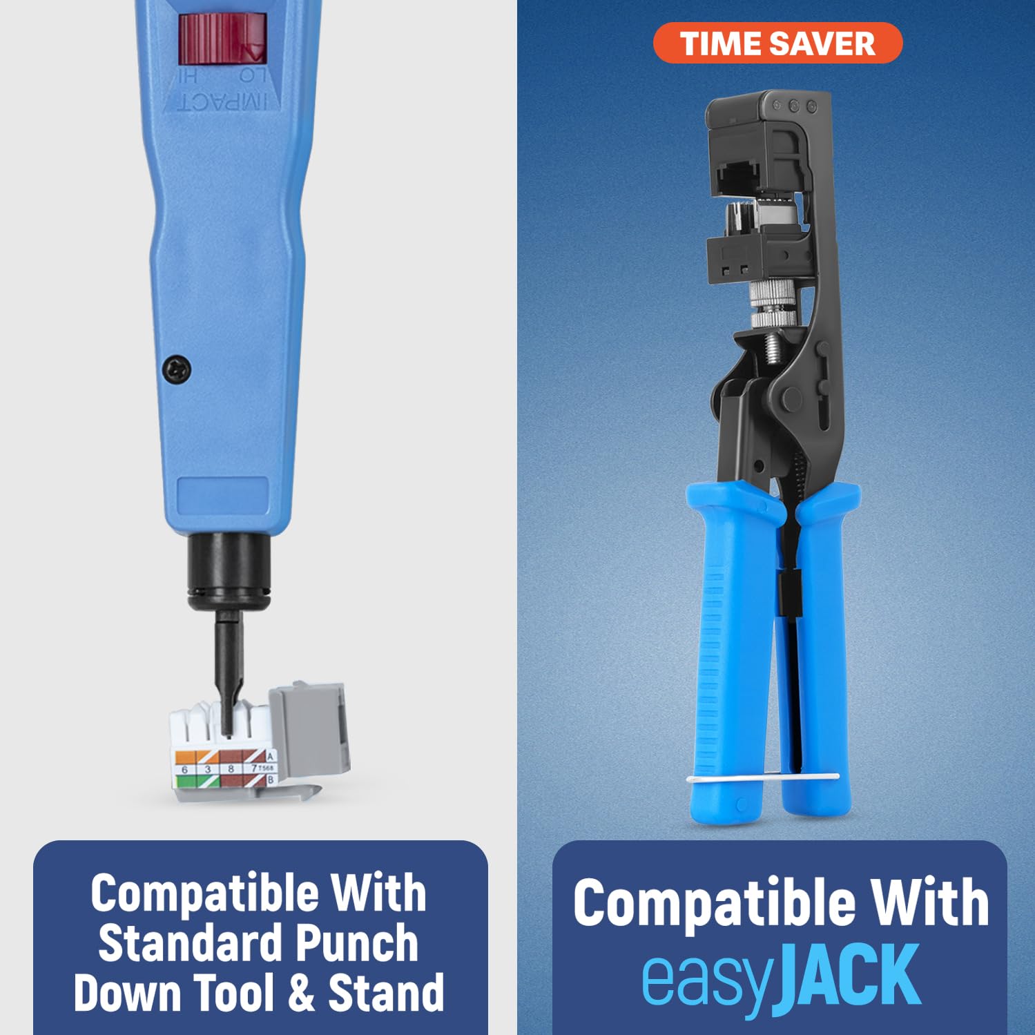 - Compatibility - compatible with our 90 degree angled speed termination tool - easyJACK (B094WB91H3). These cat 6 jacks keystone rj45 can also work in conjunction with a standard punch down tool and punch down stand for convenience.