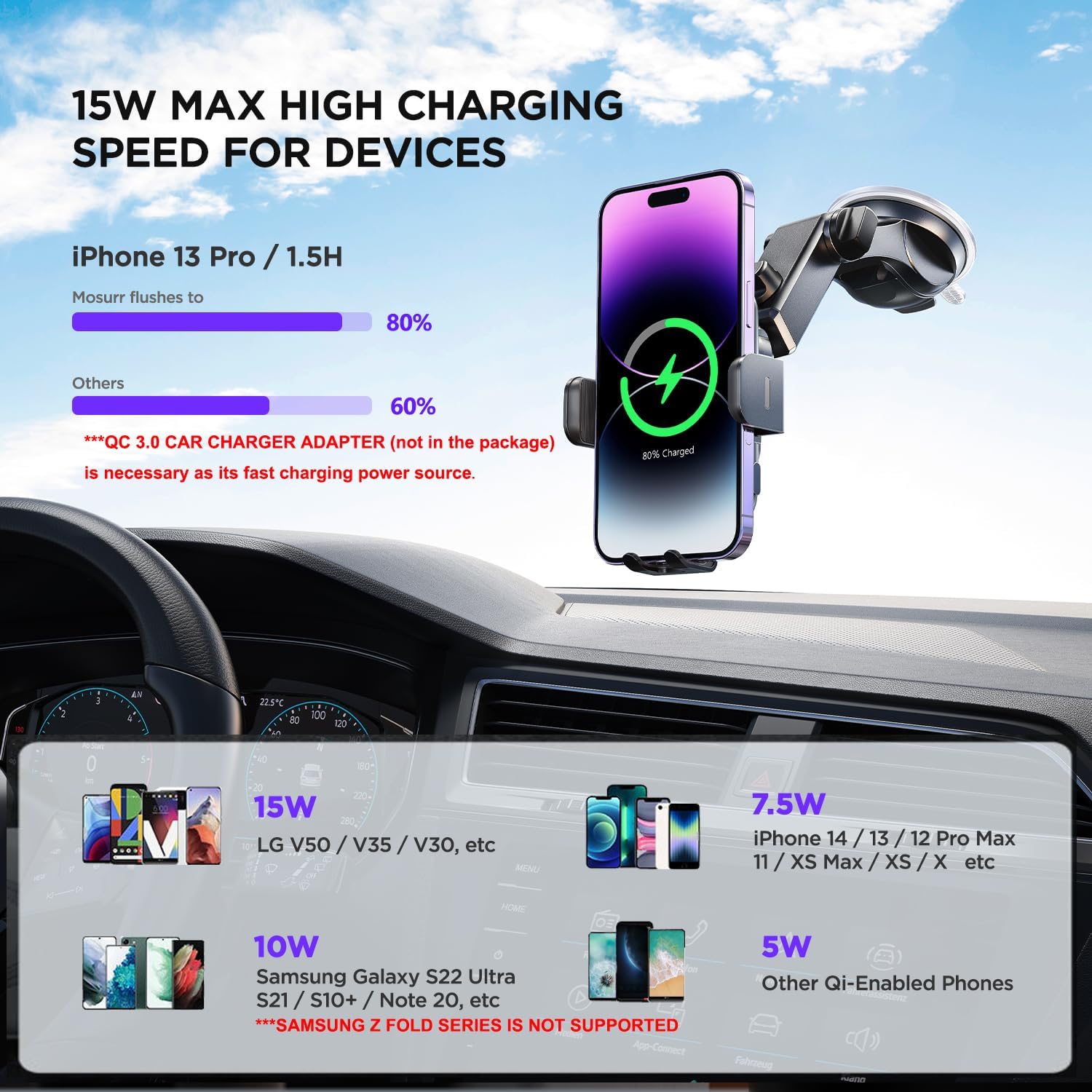 - SECURELY SUCTION POWER Up to 50LB: We greatly improved the suction power and the material of car phone holder mount wireless charging based on the market's feedback. Whether it's extreme weather, sharp turns or steep hills, the car mount always holds up and stays in place. Suction Cup can be reused and restored by simply rinsing under warm water and air drying. ***For optimal performance, allow the suction cup to secure itself to your dashboard for 30 minutes before placing your phone on the holder. This step ensures a strong, lasting bond