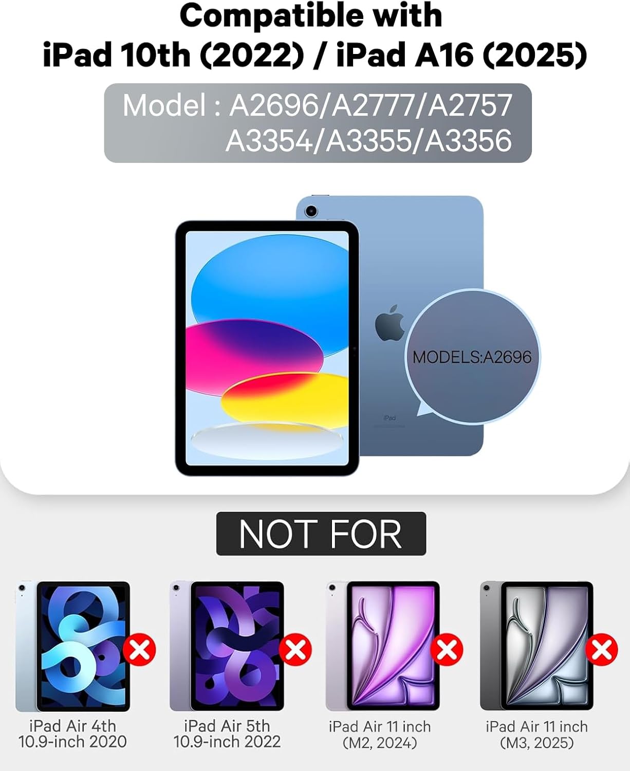 - 【Compatibility】 This wireless keyboard case is compatible with New iPad (A16) 11th Gen 11-inch 2025 (Models: A3354/A3355/A3356) and iPad 10th Gen 10.9 inch 2022 (Model Number: A2696/A2757/A2777). Please verify your tablet model carefully before purchasing. (iPad and pen not included)