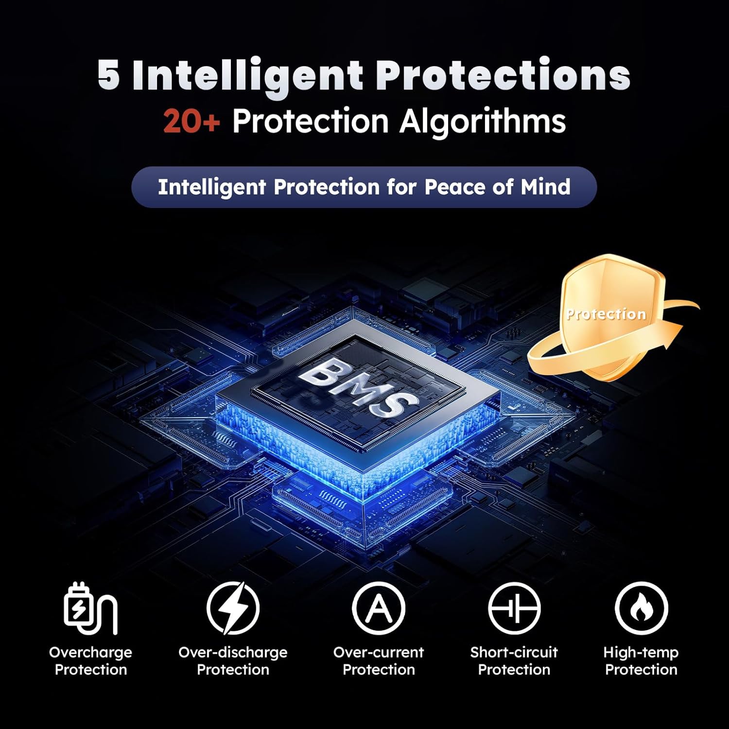 - 【Top-notch BMS Security Protection】 The built-in hardware-version 100A BMS protects the battery from safety hazards by providing 5 types of protection: overcharging, overdischarging, overcurrent, short circuit, and high-temperature environment above 70°C/158°F.