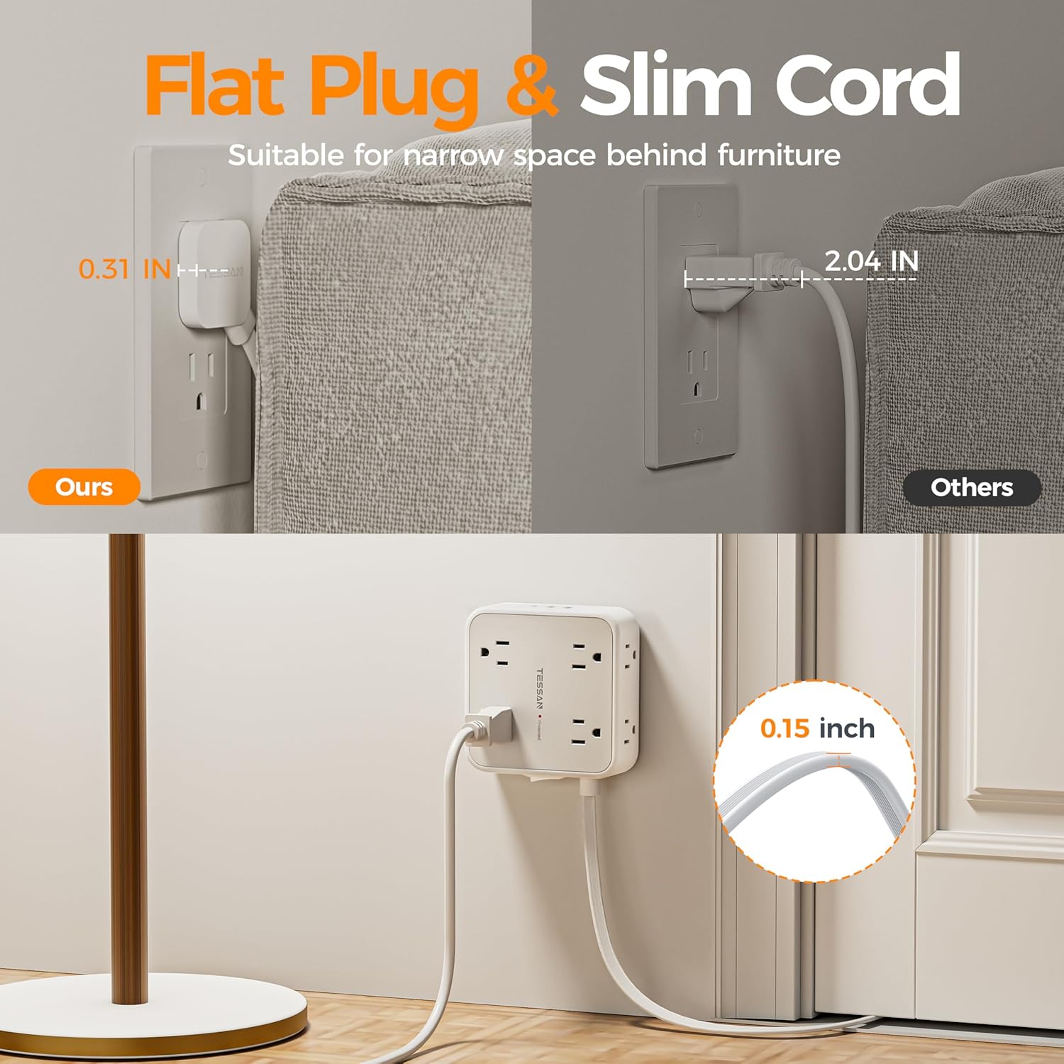 - Extension Cord Flat Wall Plug: This flat plug power strip 5 ft easily reaches distant outlets without excess length on the floor; 0.15 inch thick flat cord fits through door gaps and under carpet; 45 degree right angle design doesn't block the outlet below