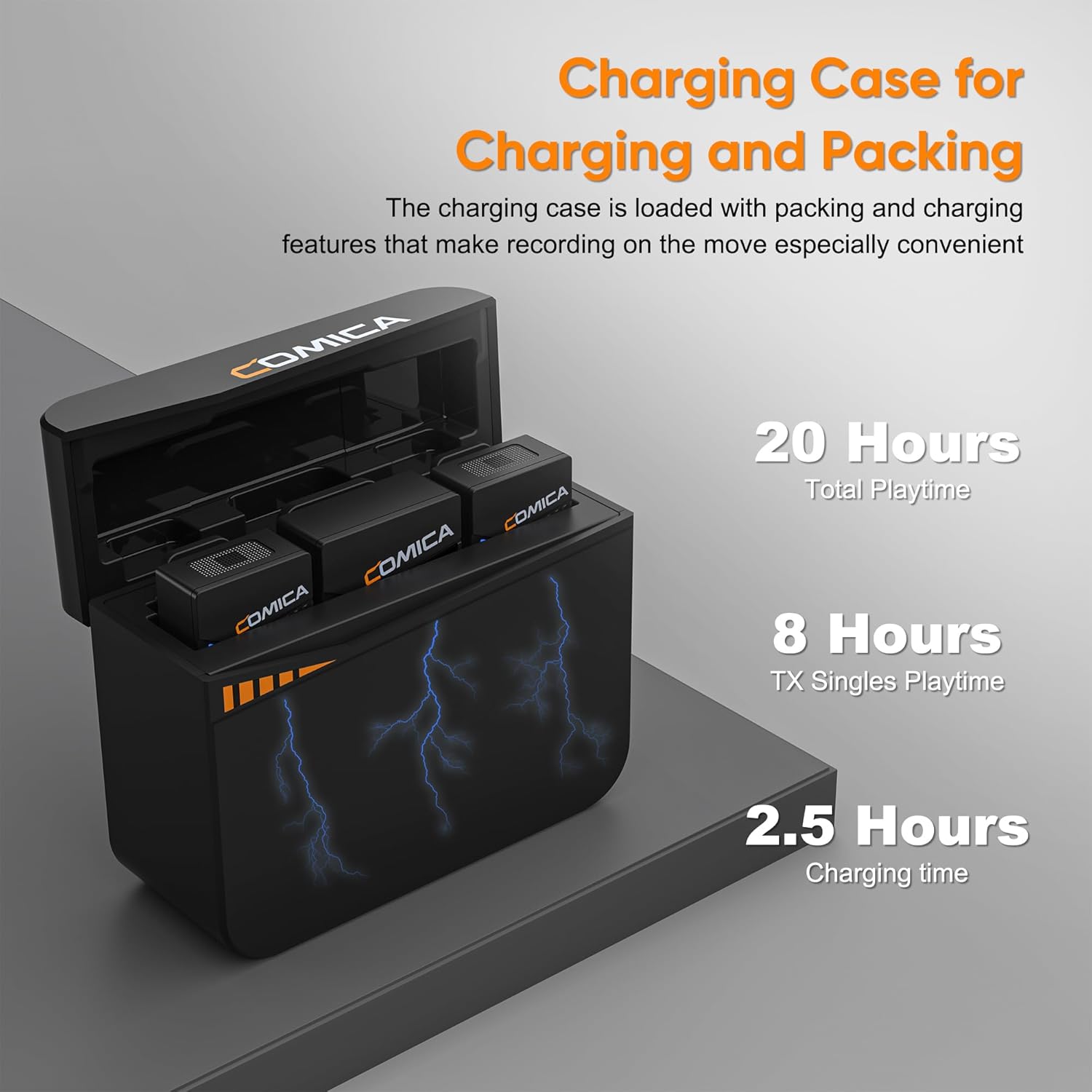 - 【Charging Case for Charging and Packing】The charging case is loaded with packing and charging features that make recording on the move especially convenient. The mic will be on and paired automatically as soon as you open the case. Its extended battery life lets you record up to 8 hours using only the RX and TX, and up to 20 hours using the case.