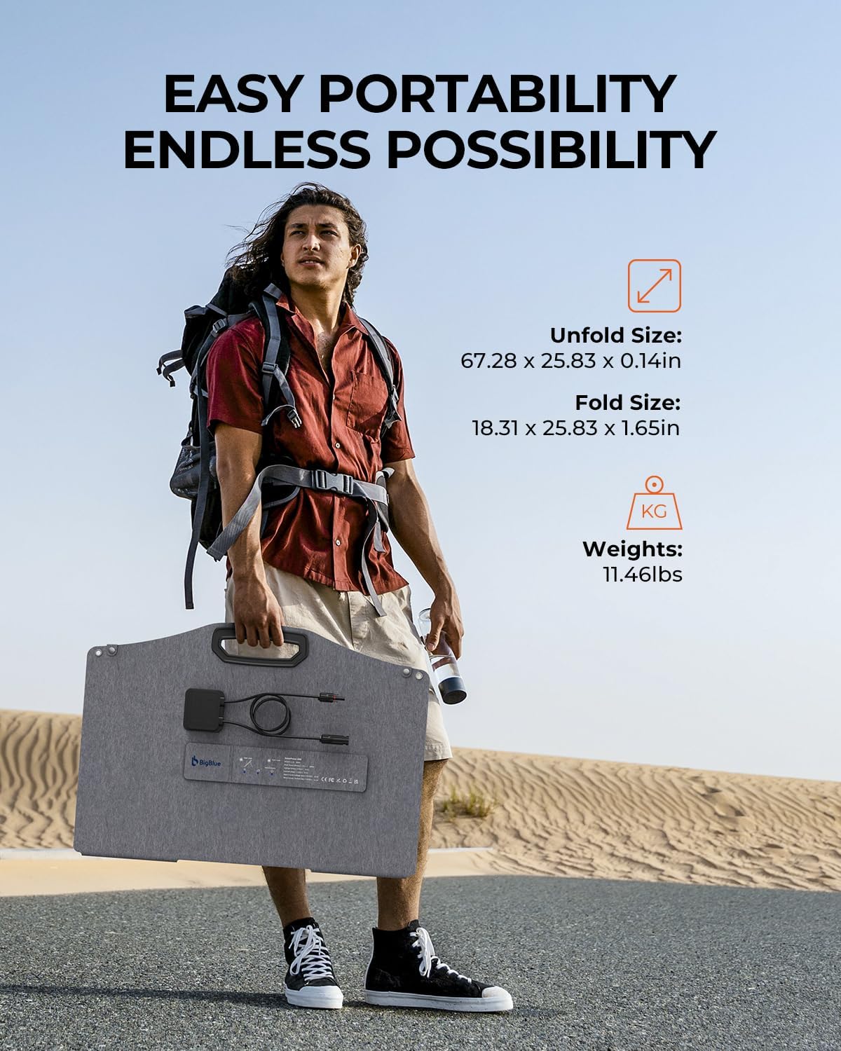 - Weather-Resistant Durability: Rated IP68 for waterproofing and built to withstand extreme temperatures, this portable solar panel is designed to deliver reliable performance in both sunny and stormy conditions, making it perfect for camping, hiking and other outdoor use.