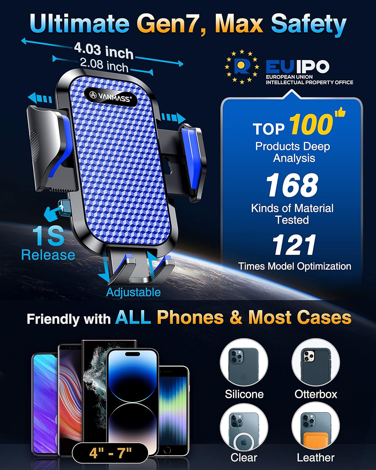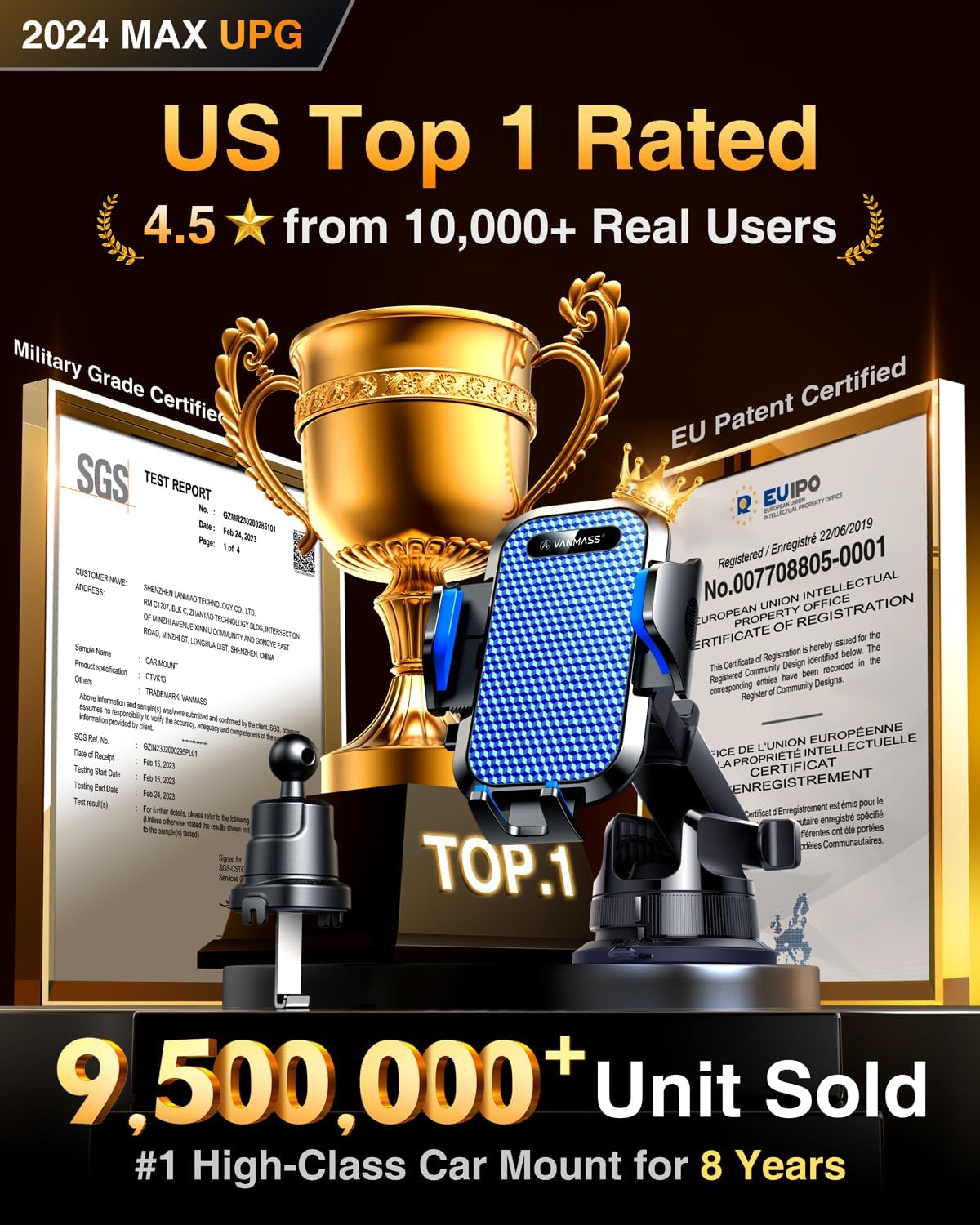 - 【True Military-Grade Certified, 2024 Ultimate Car Mount】VANMASS, the leader in high-end car phone holder. Over the past 8 years, We have listened to the voices of millions of users, rigorously tested to MILITARY GRADE standards (stability, compatibility, flexibility, security, durability). Finally, we overcome all weaknesses to design the Ultimate Model that we are most satisfied with. This item obtained international military-grade shockproof certification No. GZMR220601855501