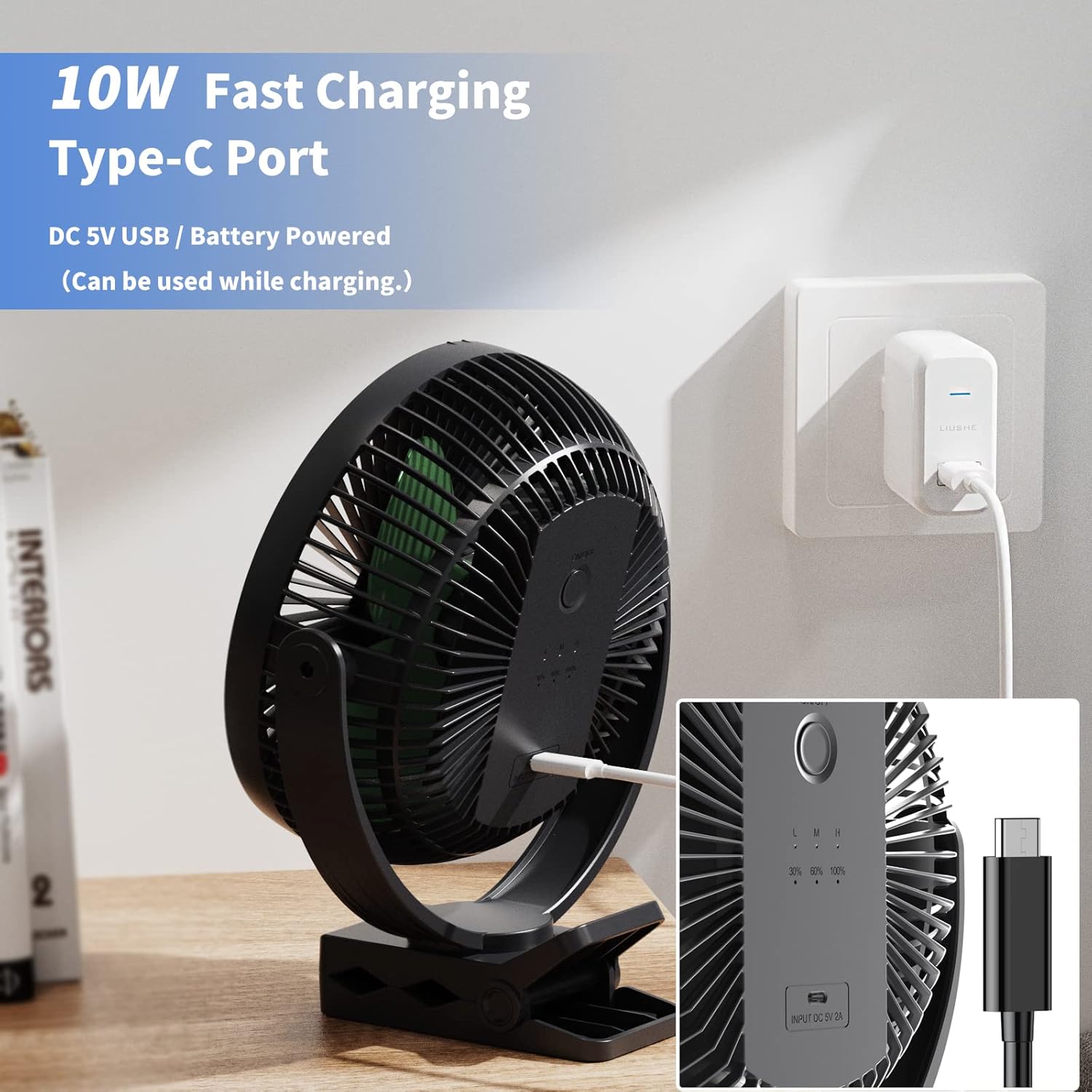 - Rechargeable Fan - This battery powered fan comes with a 10000 mAh. It has the potential to run all day on a full charge. With its USB-C port, it offers 10W charging speed. The USB fan's charging port is compatible with a wide variety of devices, including laptops, phone adapters, power banks, and USB chargers.