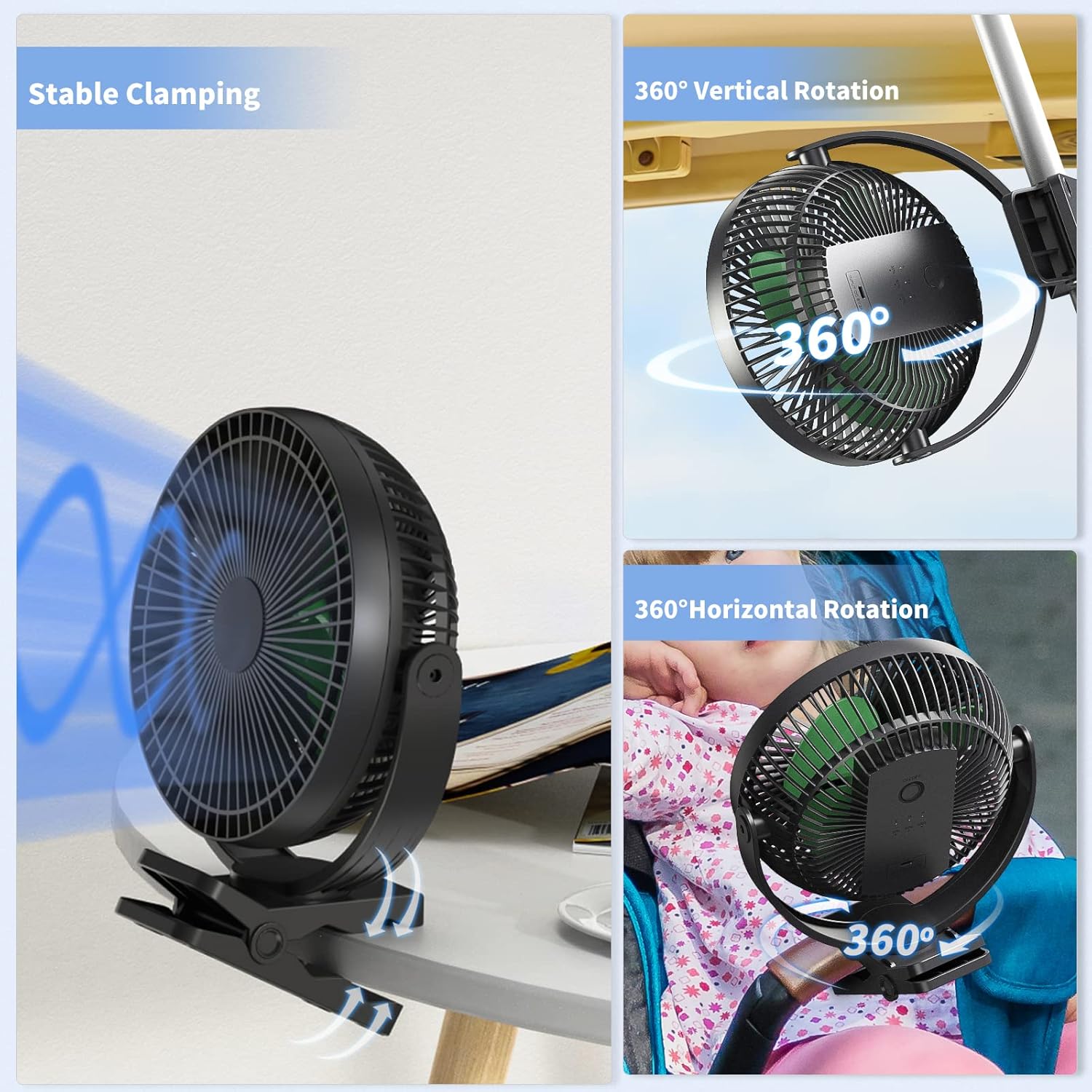 - Desk Fan - The head of this clip fan is flexible and can be rotated 360 degrees vertically and horizontally, so we can direct the air as we like. There is non-slip silicone on the bottom of the rechargeable fan, it will not scratch the desktop, and it can stand firmly on the desktop even in the super wind mode.