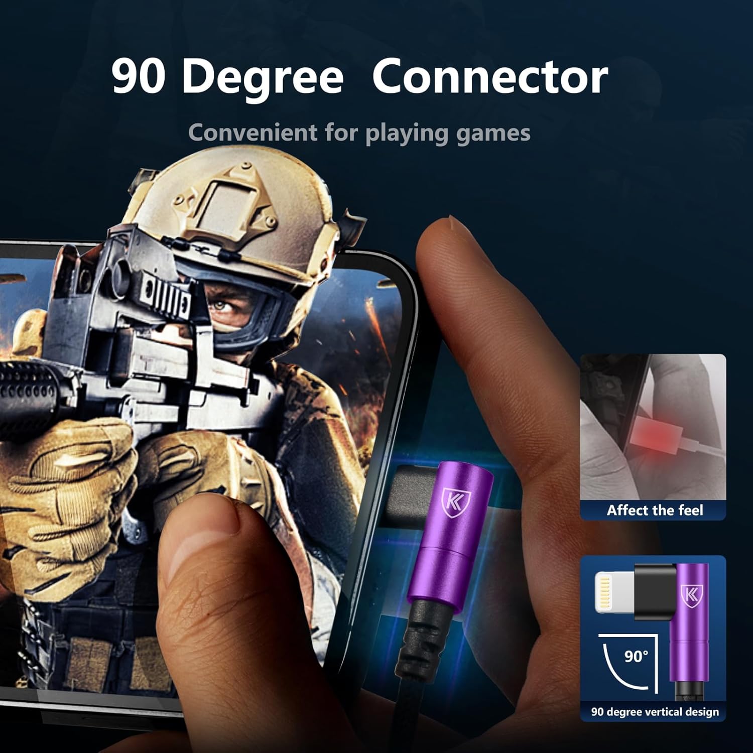 - 90 Degree iPhone Charger Cable: The 90 degree lightning cable 10ft comes with L shapes connections (Lightning end), which can fit the device sideways. 90 degree extra long 10 FT iPhone charger cord is more convenient for playing games, watching video when you while charging.