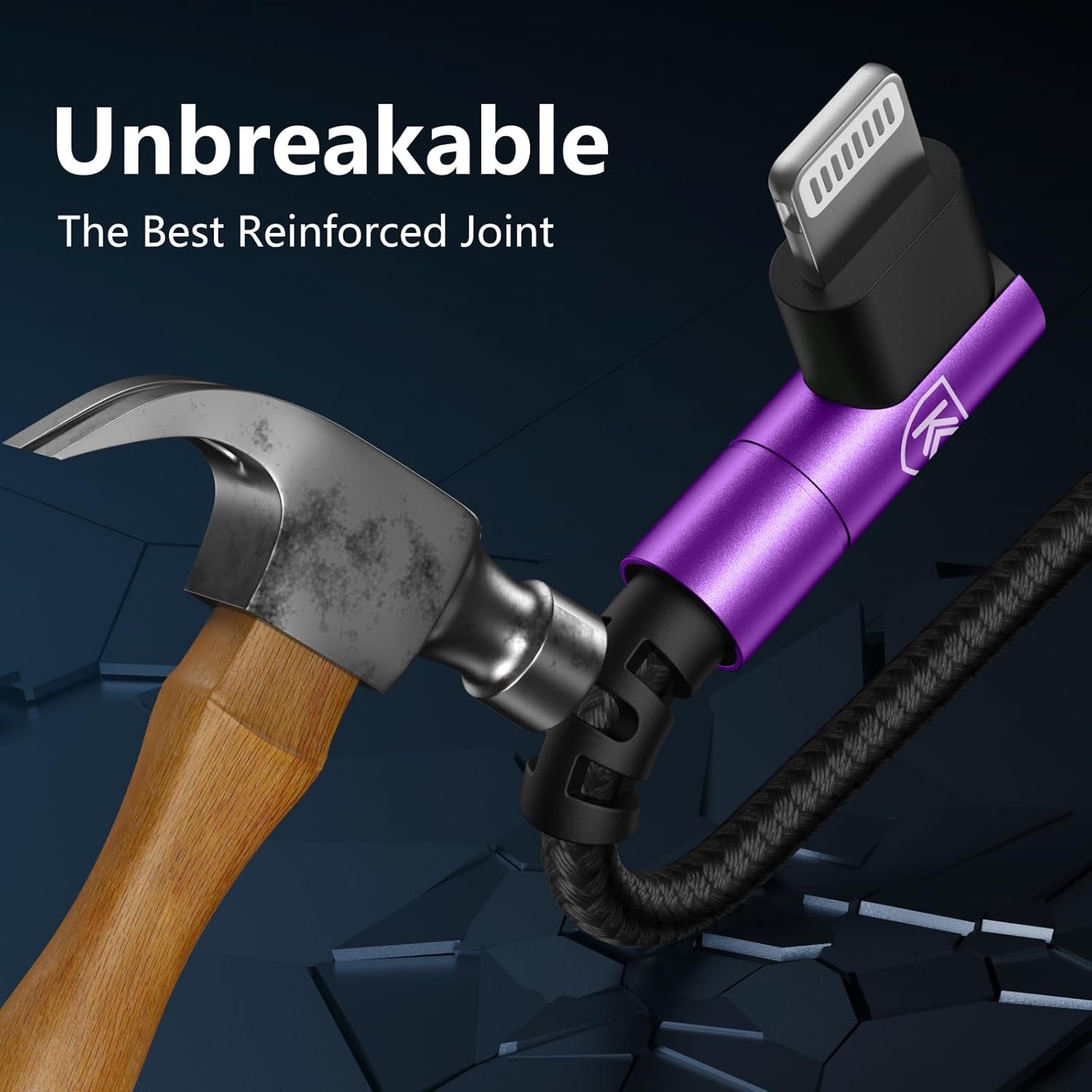 - Durable and Flexible: iPhone charging cable designed with premium materials, comes with nylon braided surface, tangle-free. It has been tested with 10,000+ times bend and strong bearing capacity. 90 degree aluminium alloy connectors resist heat and corrosion, reduced the fraying and wearing of the cable joints, prolonging its life span.