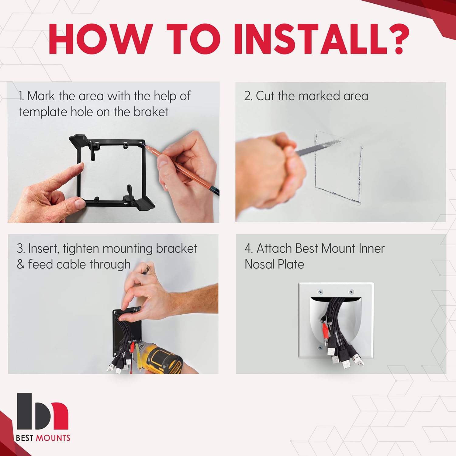 - No More Dangling Cables - Recessed low voltage wall cable pass through plates give your installation a finished appearance by hiding TV cords for wall mount TV but allow you the versatility of using the cable types of your choice, Just bring a drywall saw and screwdriver you're ready to hide those ugly dangling cables