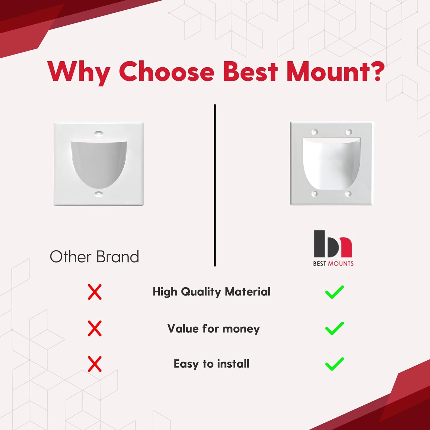 BestMounts - 144 Pack In Wall Cable Management TV Cord Hider for Wall Mounted TV - Recessed Wall Plates Cable Pass Through - Dual Gang Behind Wall Cable Management up to 8-10 Low Voltage Cords