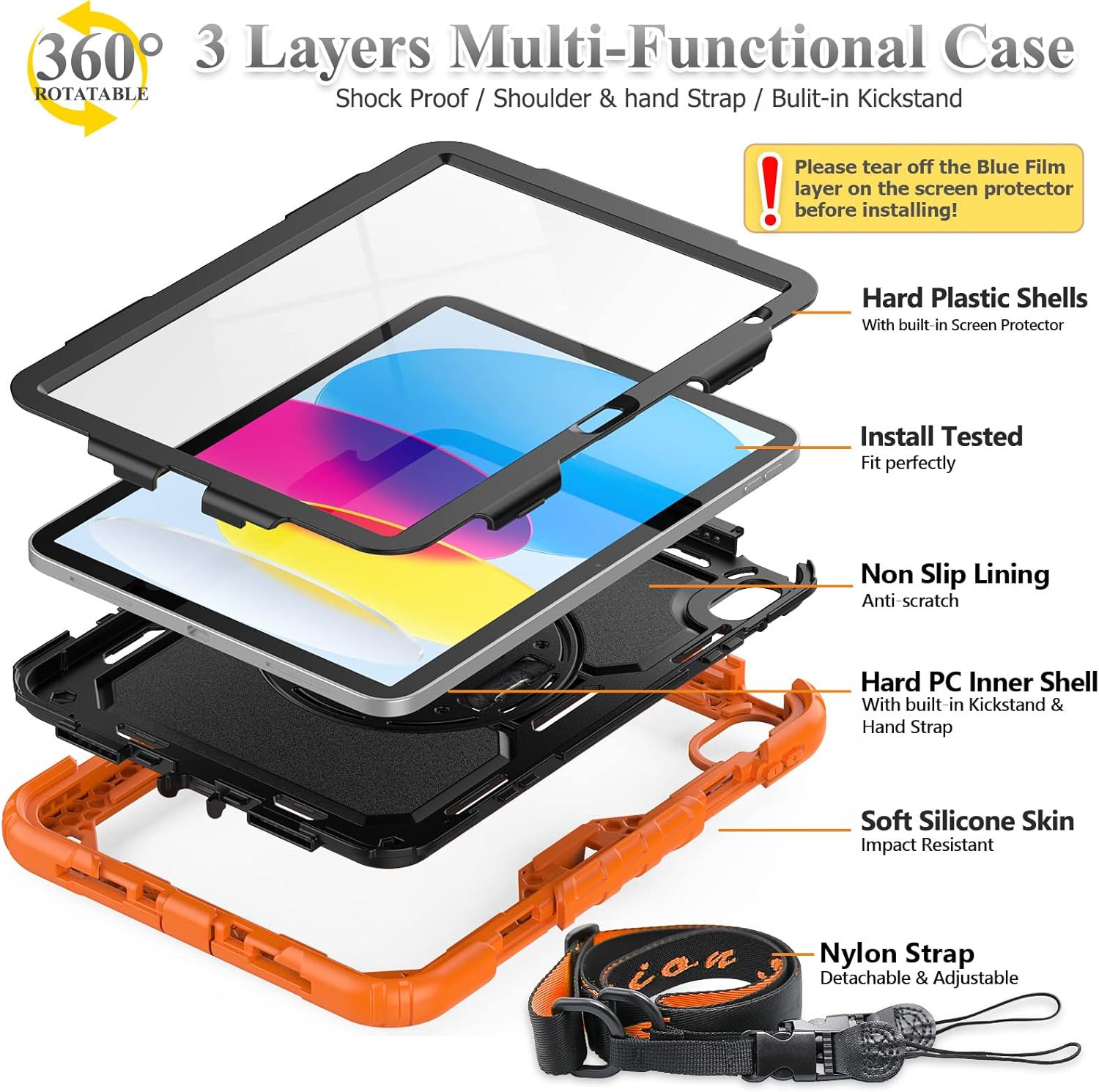 SEYMAC stock Case for iPad (A16) 11th/10th Generation 11''/10.9'' 2025/2022, Full-Body Drop Protection Case with Screen Protector &360° Rotate Hand Strap/Stand, Black+Orange