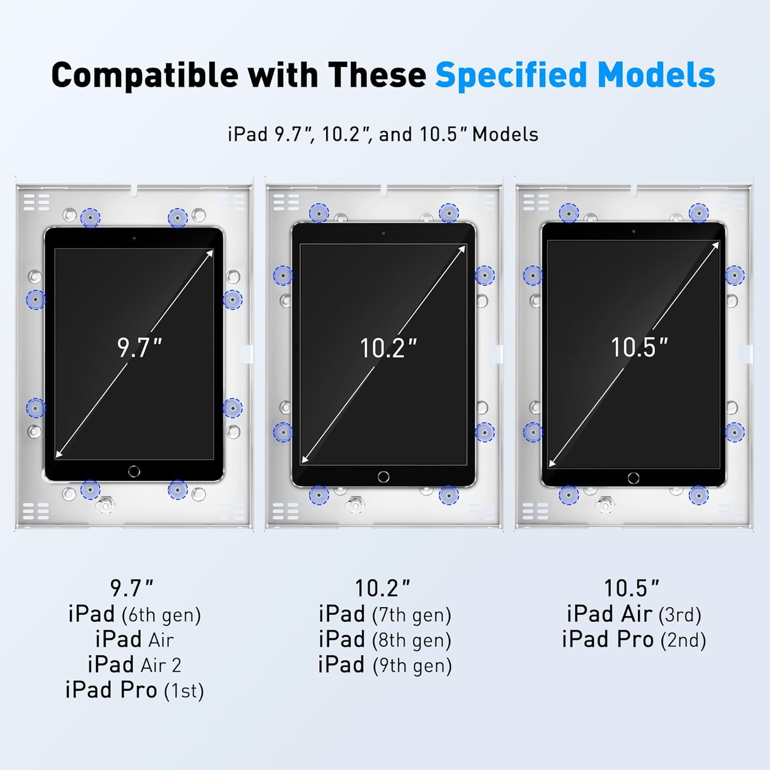 - Universal Compatibility: This locking tablet stand is designed to fit various iPad models, including 9.7" iPad, 10.2" iPad, 9.7" iPad Air, 9.7" iPad Air 2, 10.5" iPad Air, and the 9.7" iPad Pro and latest 10.5" iPad Pro. Our stand is ideal for restaurants, offices, hotels, and other professional environments. Note: Not suitable for iPad models larger than 10.5 inches (e.g., iPad Pro 11-inch or 12.9-inch models). Please check compatibility before placing orders.