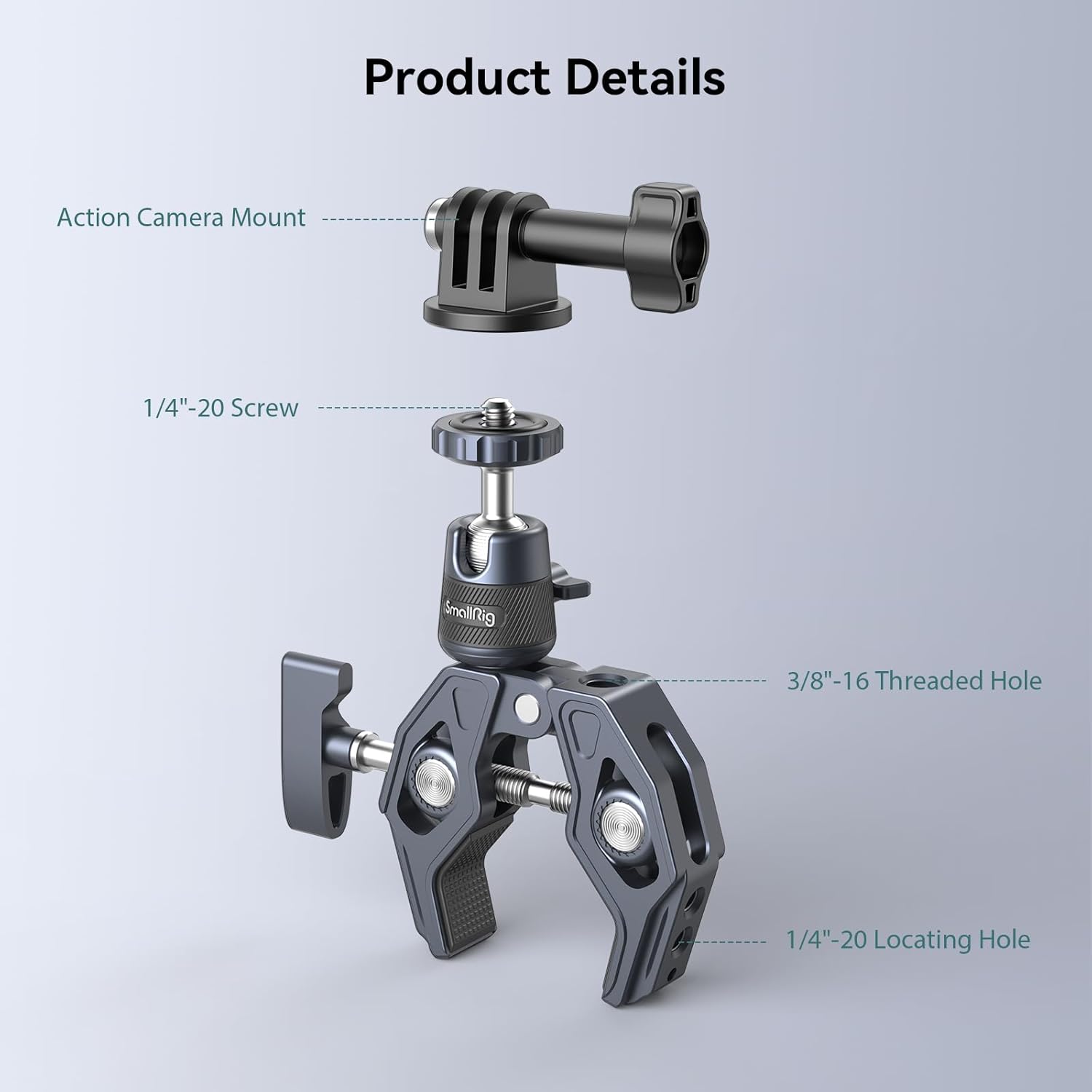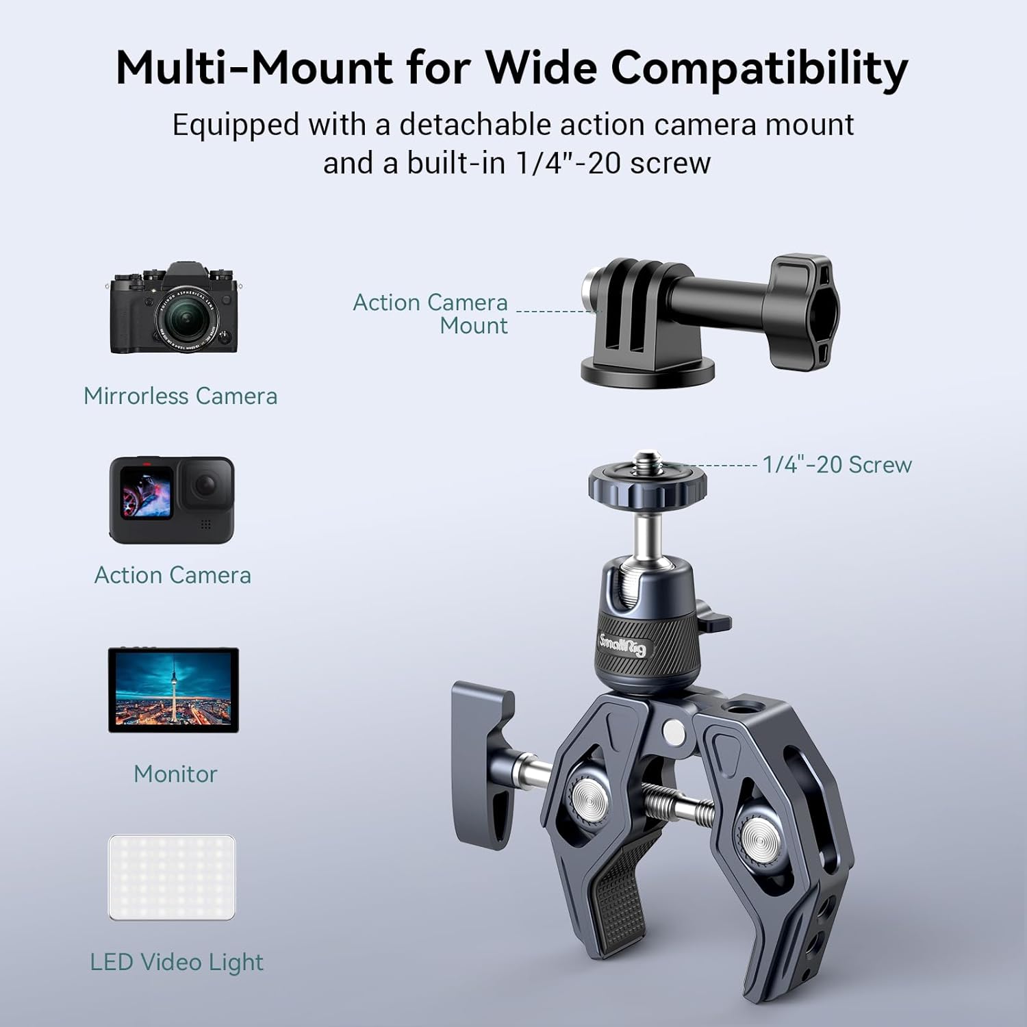 - Wide Compatibility: SmallRig Camera Mount Clamp 4102B is equipped with 1/4"-20 threaded holes, and 3/8"-16 threaded holes to quickly connect action cameras, monitors, LED lights, etc.