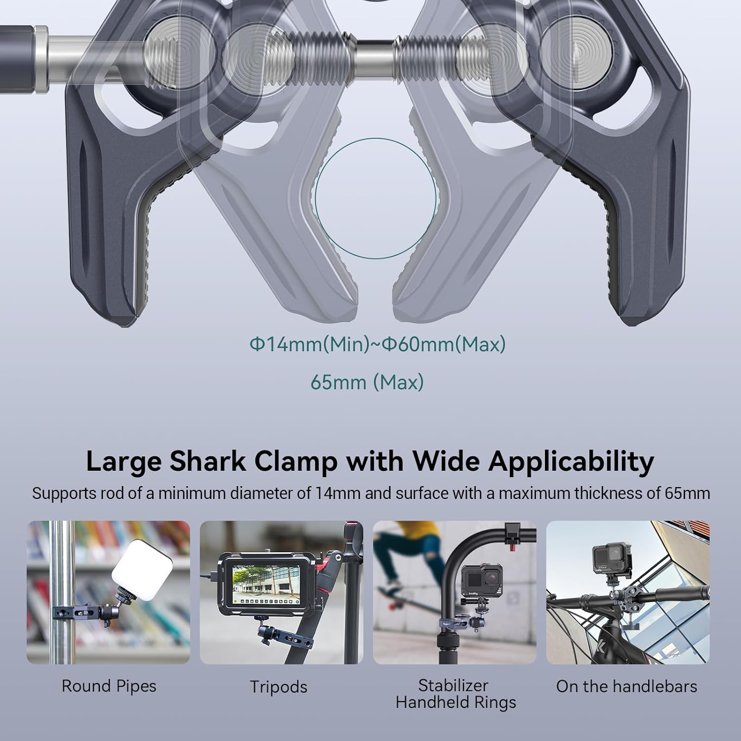 - Adjustable Jaw: The clamp supports a rod of a minimum diameter of 14mm and a surface with a maximum thickness of 65mm for you to fix on round pipes, tables, bike motorcycle handlebars, tripods, utv car, and stabilizer handheld rings.