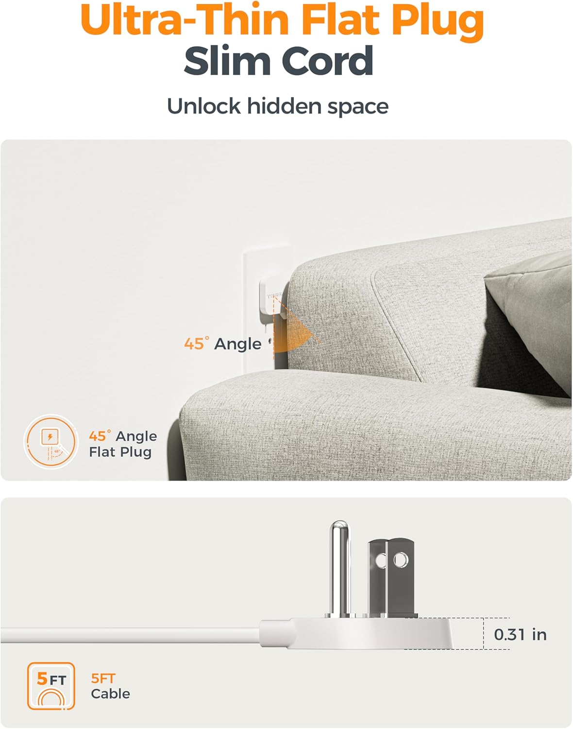 - Right Angle Flat Plug: Flat plug power strip features an ultra-slim 0.31in flat head, this extension cord flat wall plug fits into confined spaces and discreetly behind sofas, beds; The 45 degree right angle design create additional space for other plugs