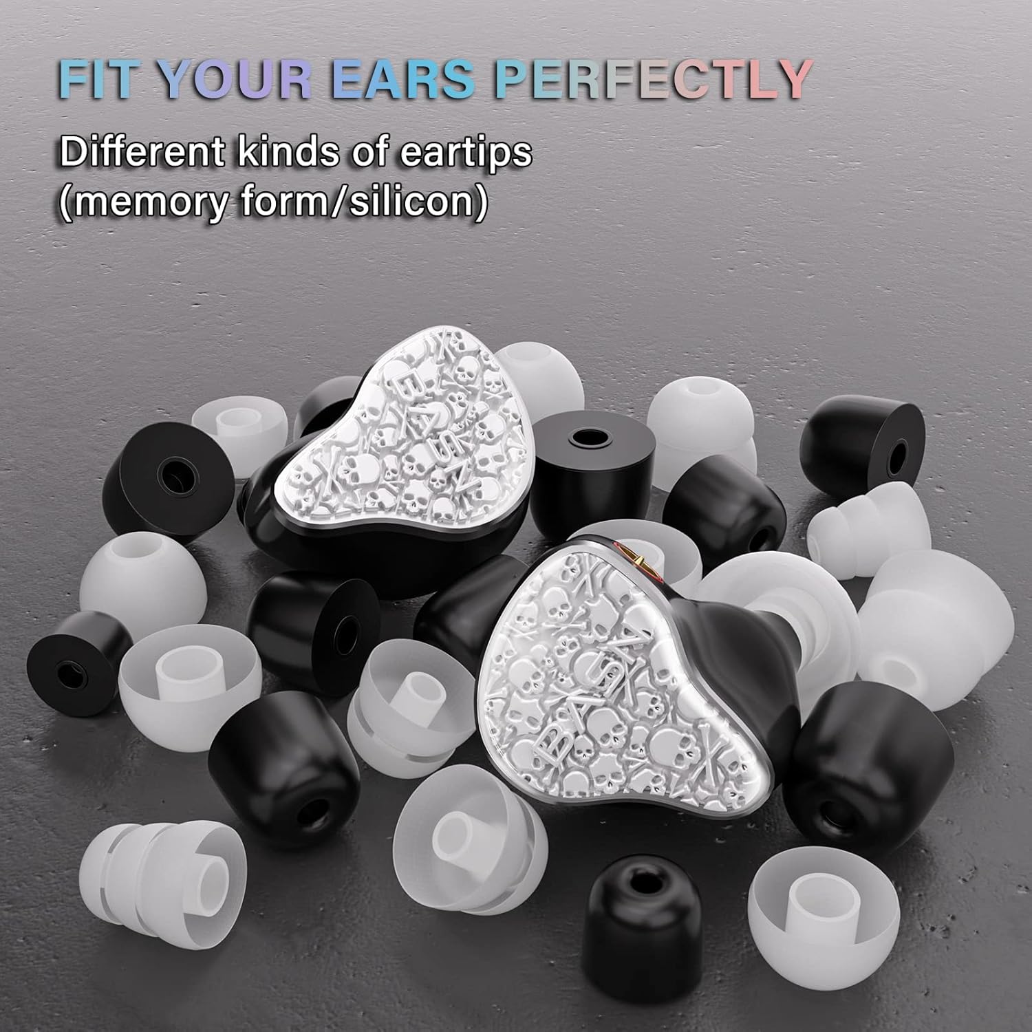 - LONG-LASTING COMFORT - Two different styles of earbud tips - silicone and memory foam - are provided in 12 sizes to establish a comfortable seal in any ear. Adjustable ear hooks ensure a perfect fit, making it feel like the iem earphones are custom tailored just for you