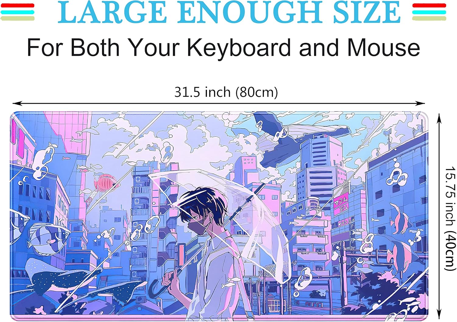 Anime Kawaii Desk Mat Mousepad Cute Japanese Large Gaming Mouse Pad XXL, Pastel Aesthetic Purple Blue Laptop Keyboard Mouse Mat, Magical Fantasy City Girl Gamer Computer Desktop Mat 31.5x15.75 in