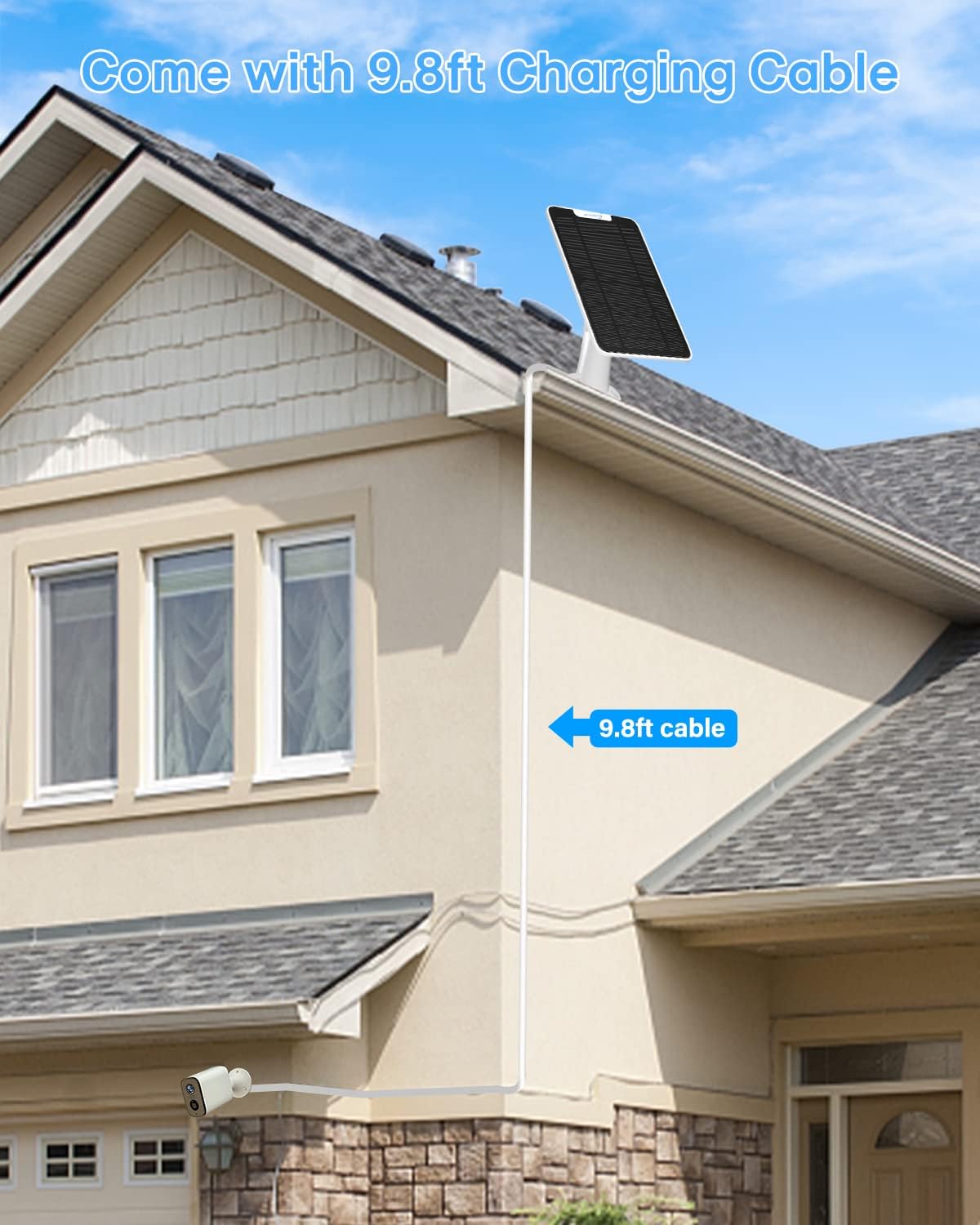 - 【360°Adjustable Bracket & Easy to install】Our solar chargers are equipped with 360° rotation adjustable secure wall mount bracket & extra-long 9.8ft/3m charging cable, which allows you to easily position your solar panel to capture the maximum sunlight exposure in different seasons. WARM TIP: make sure the magnetic connector pins are fully clicked in place when connect to the Arlo camera.