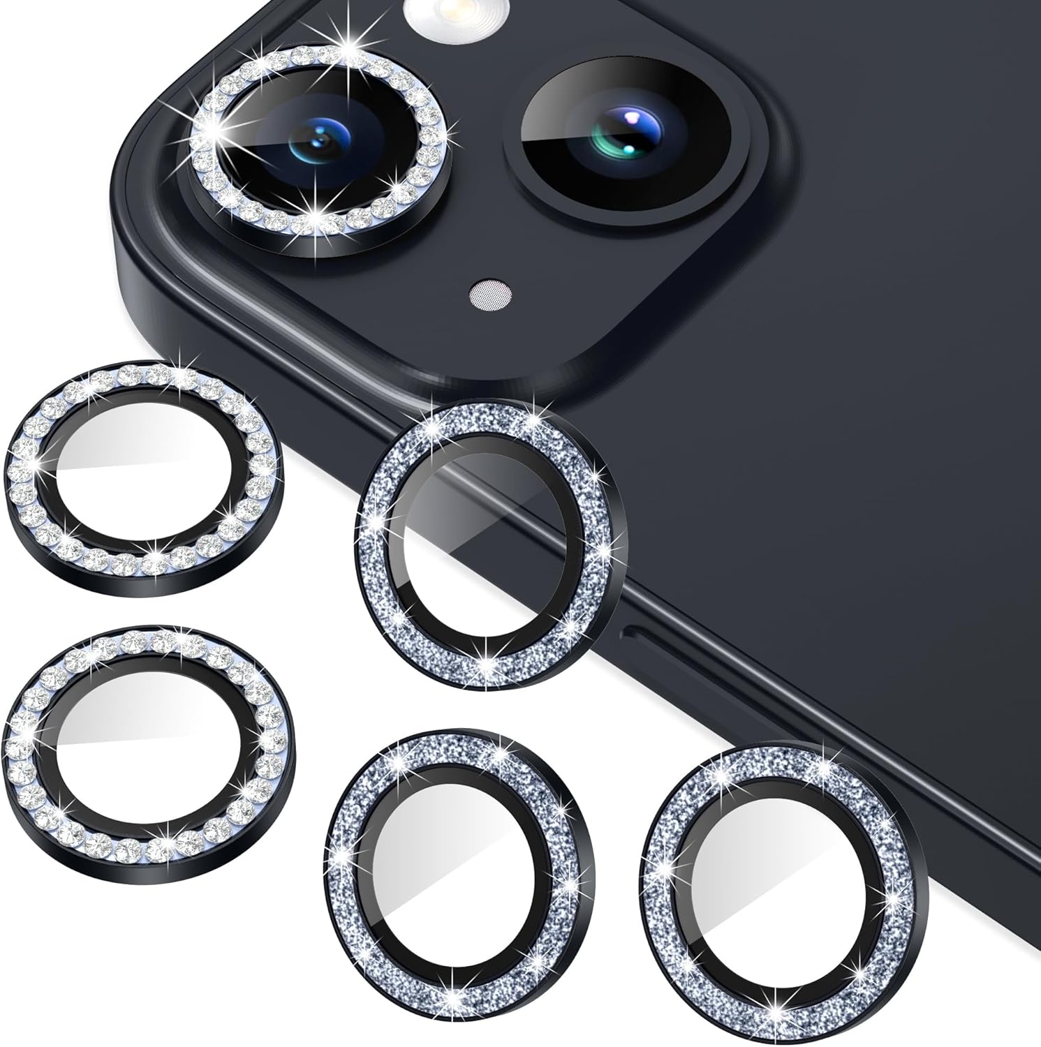 AGVEE 3+3 for iPhone 14 6.1" / 14 Plus 6.7" Camera Lens Protector, Bling Diamond & Bling Glitter Metal Ring 9H Tempered HD Glass Camera Protector Cover Film, Bling-Black