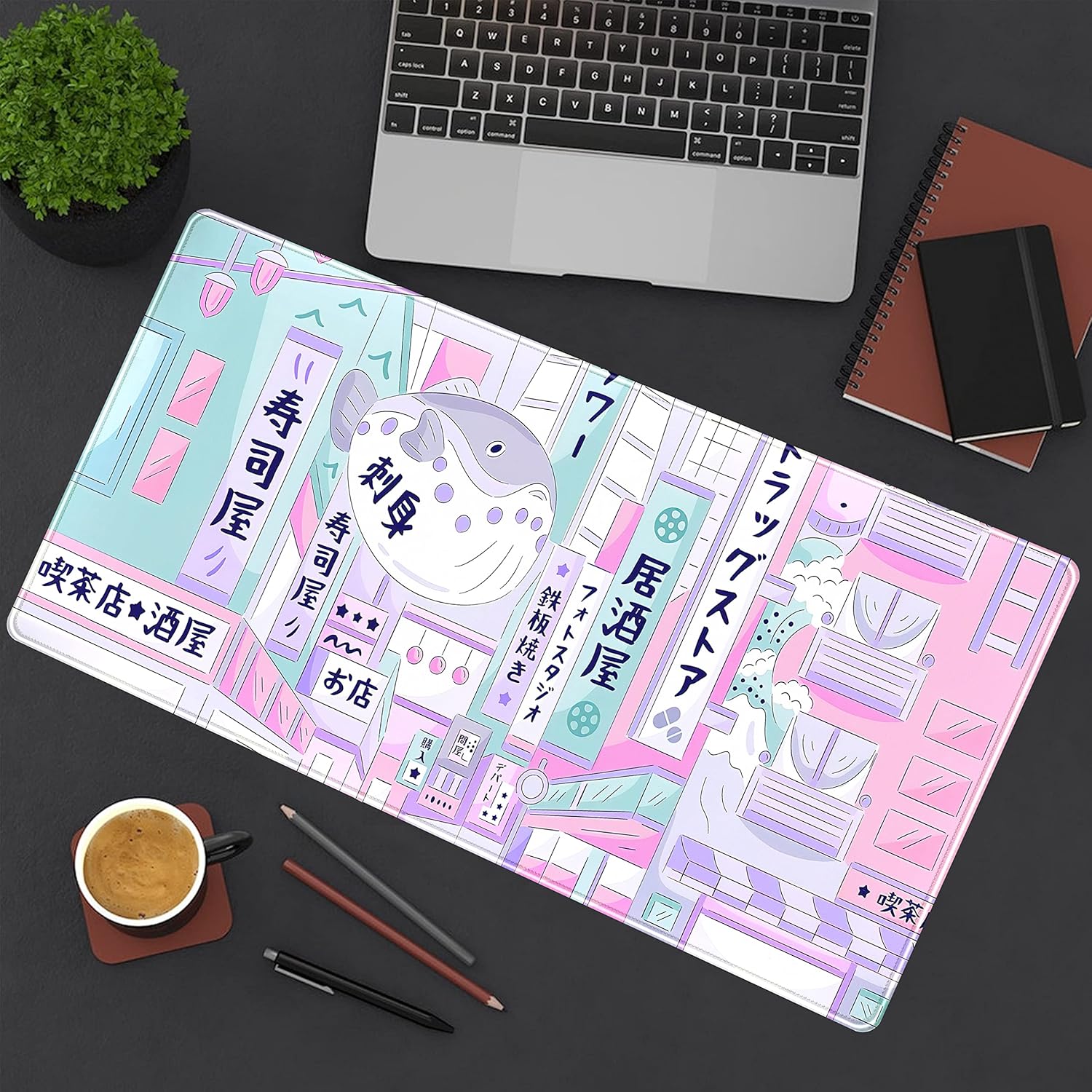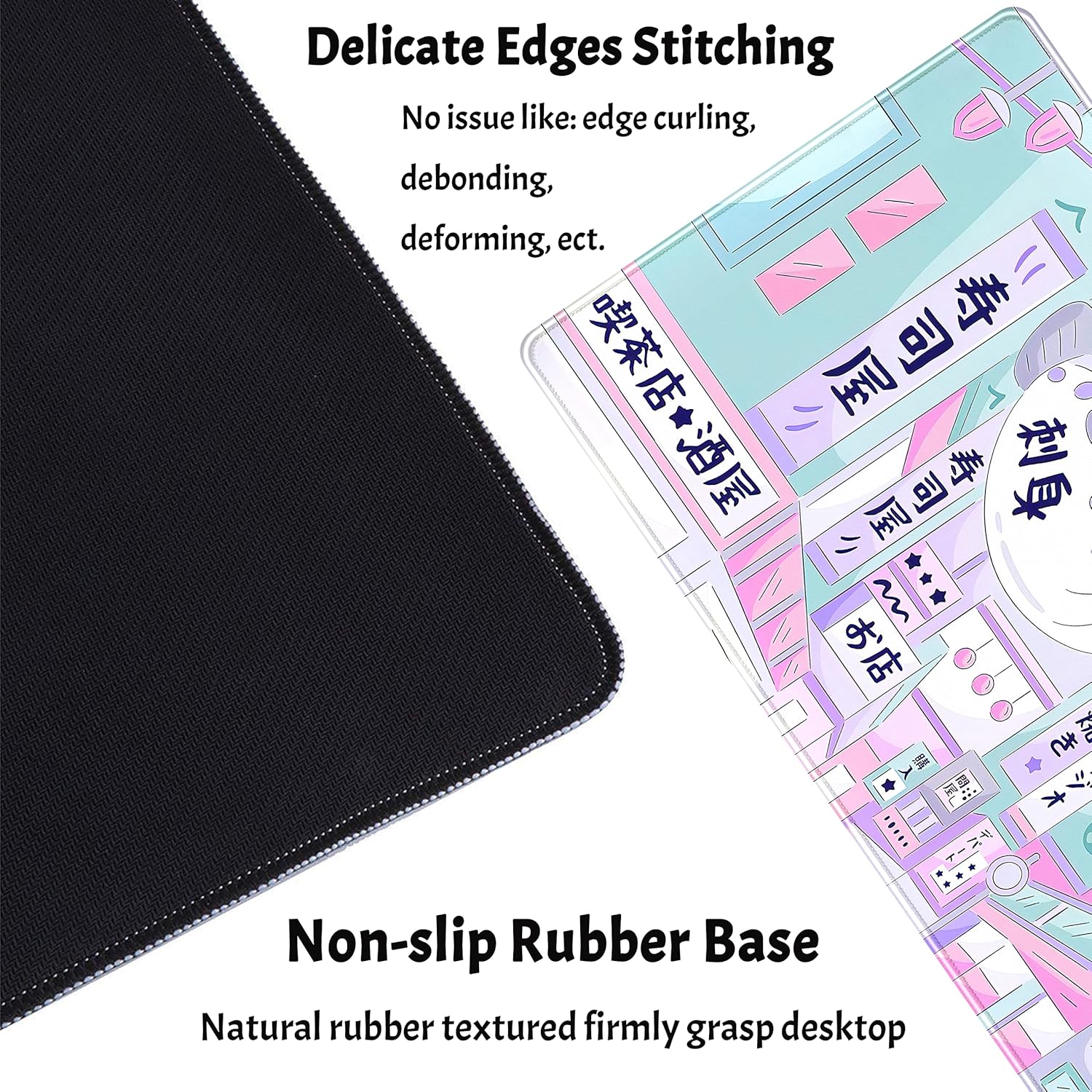 - 【Extended XX-Large Size Design】Cute japanese tokyo street gaming desk pad 31.5×15.75×0.12 inch(800×400x3mm)size is large enough to accommodate your laptop, keyboard, mouse and other desk items.