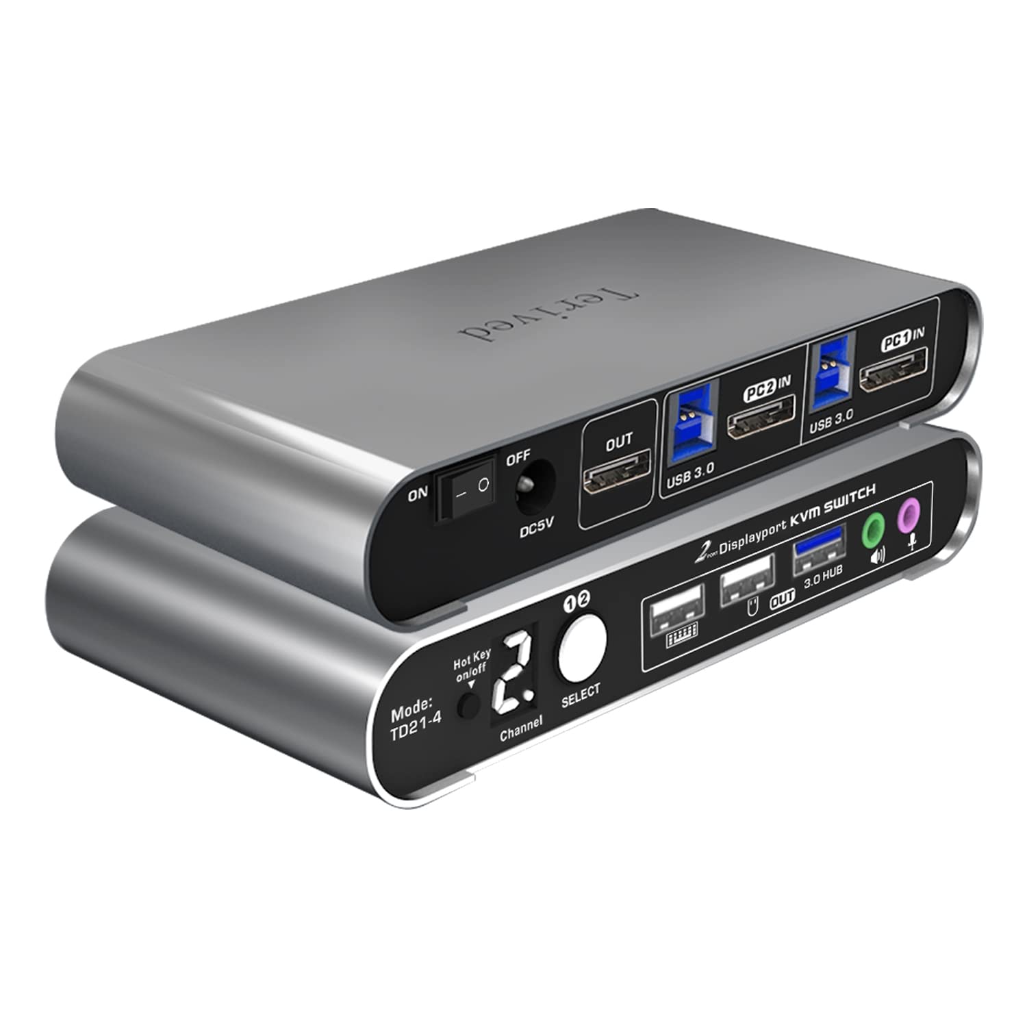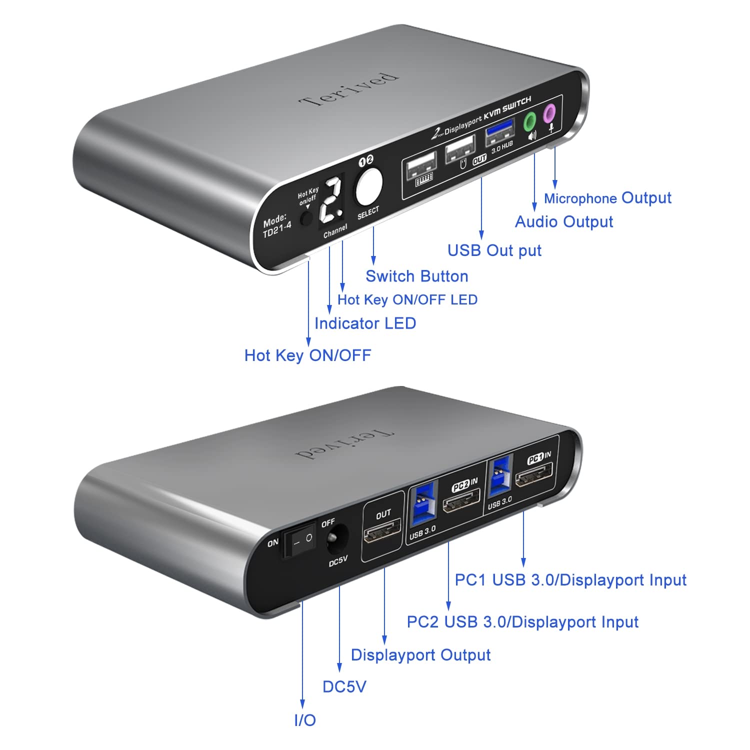 - Two computers one DP monitor KVM switcher- Controls 2 Displayport interfaced computers or other applicable devices using one keyboard, a mouse, one monitor with audio & microphone, and USB 3.0 HUB for data transferring rate up to 5Gbps/s (10 times faster than USB 2.0)