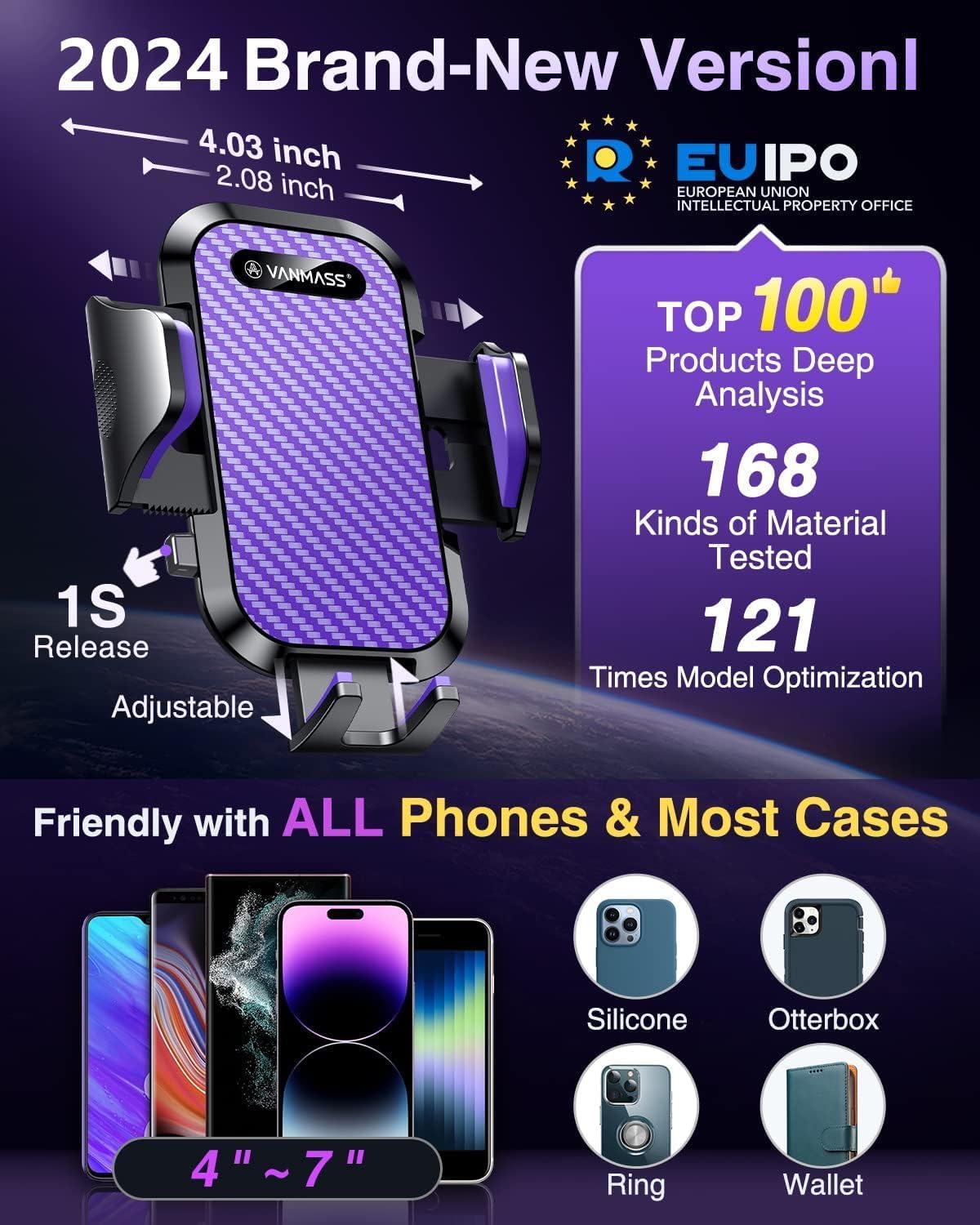 - 【Best Military-Grade Phone Holder】VANMASS's best mount with the highest rating! Preferred by 10,000,000+ Customers; Designed by world-class professional team; enjoy EUIPO Patent (No.007708805-0001), Military-grade certificate (No. GZMR220601855501), CP65/REACH/ROHS; It born based on studied 500+ holders & 500+ suction cups & 4,000+ materials; Exclusive 2 engaged gears clamp arms, 5,000+ open/close test; 10,000+ vibration resistance; 20,000+ miles road tests; -40~194℉ laboratory test