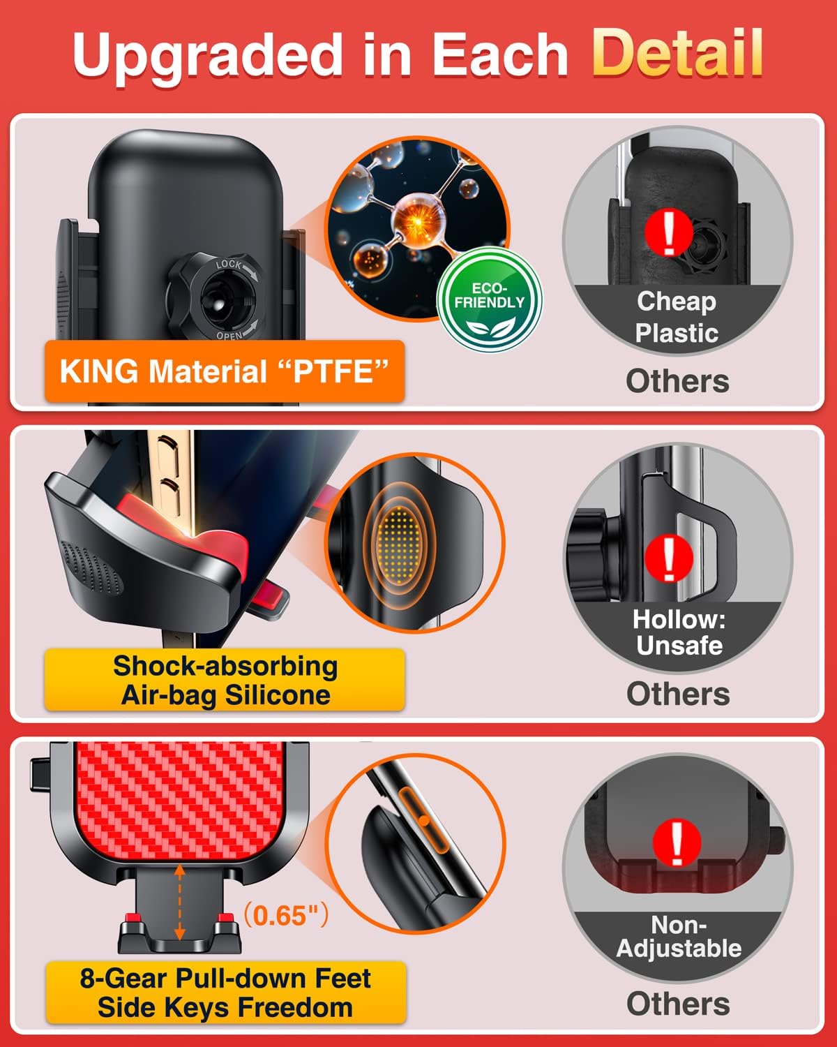 - 【Details are King & Key】Military-grade shockproof panel soft silicone on bottom feet innovative air capsule silicone (soft & highly elastic) inside the clamps provide full protection, increase friction, prevent phone from sliding; Ergonomics fingerprint release button make the fastest & tightest press with the minimal force (inspired by 1,000,000+ customers' voice); 0"-0.78" adjustable feet for all 4"-7" phones; Never be knocked out, kicks the fixed feet phone holder out