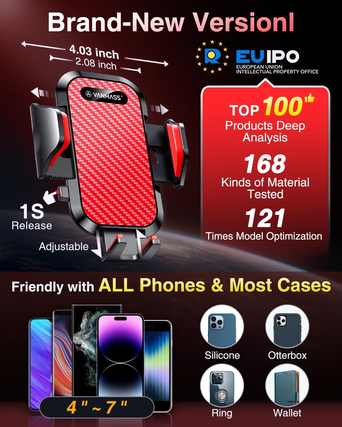 - 【Best Military-Grade Phone Holder】VANMASS's best mount with the highest rating! Preferred by 10,000,000+ Customers; Designed by world-class professional team; enjoy EUIPO Patent (No.007708805-0001), Military-grade certificate (No. GZMR220601855501), CP65/REACH/ROHS; It born based on studied 500+ holders & 500+ suction cups & 4,000+ materials; Exclusive 2 engaged gears clamp arms, 5,000+ open/close test; 10,000+ vibration resistance; 20,000+ miles road tests; -40℉-194℉ laboratory test