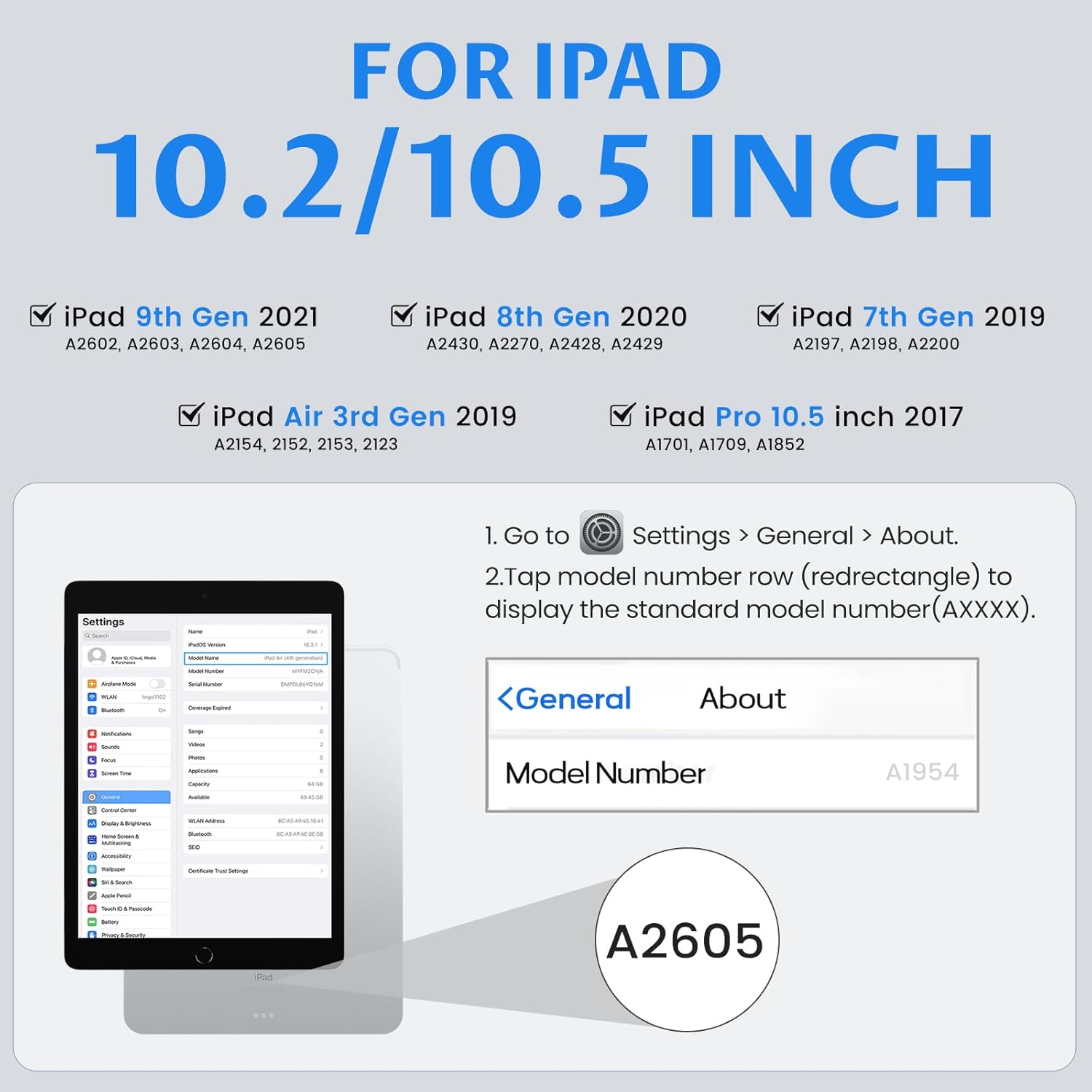 - 【For iPad 9th Generation Case with Keyboard】Compatible Keyboard Case for iPad 9th Generation - A2602, A2603, A2604, A2605; Keyboard Case for iPad 8th Generation - A2430, A2270, A2428, A2429; Keyboard Case for iPad 7th Generation - A2197, A2198, A2200; iPad Pro 10.5 inch case with keyboard 2017 - A1701, A1709, A1852; iPad Air 3rd Generation - A2123, A2152, A2153, A2154 Note: Please check the bottom of the back of your iPad to confirm the model number "AXXXX" before purchasing to prevent size errors