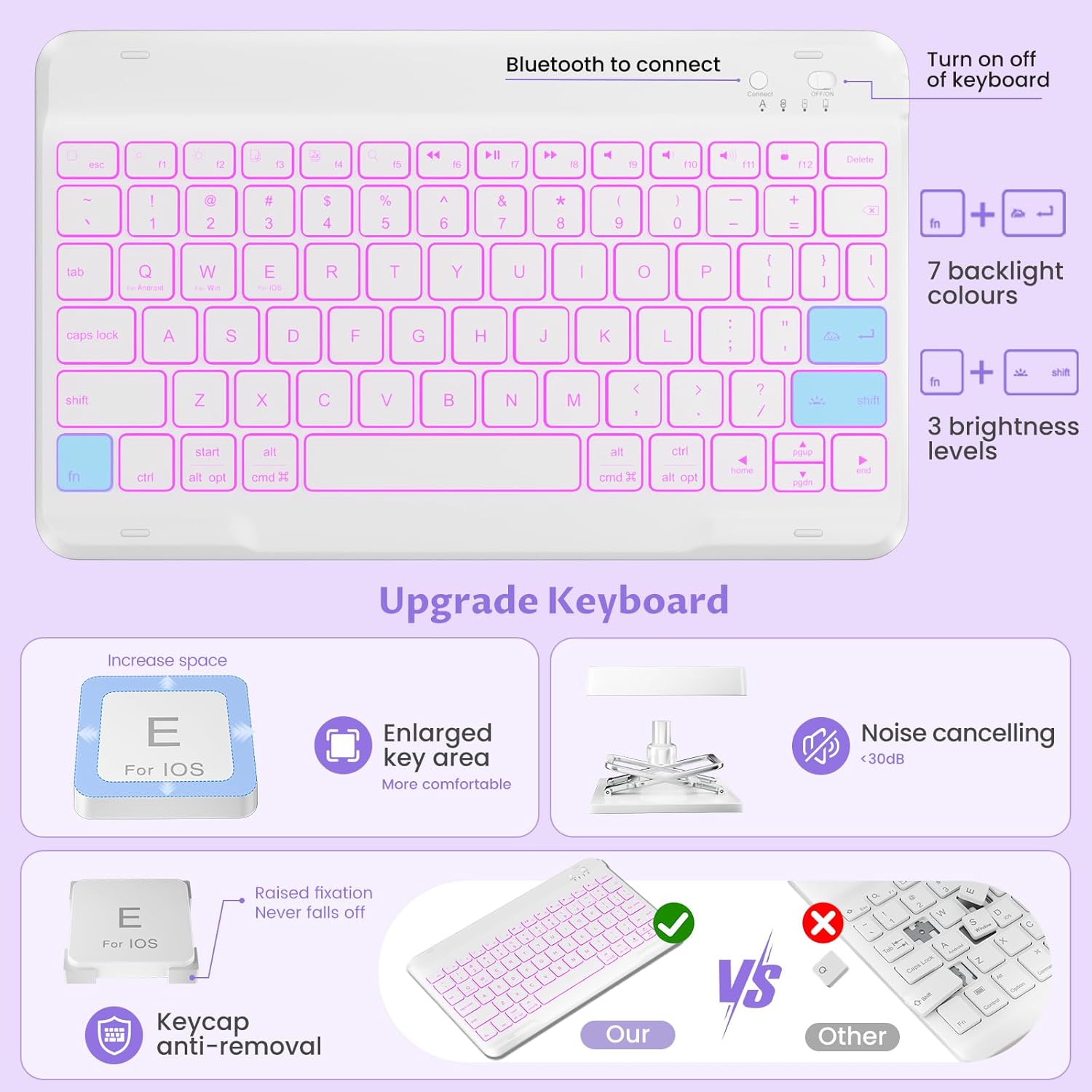 - 【Detachable Backlit Keyboard】7-color backlit keyboard for iPad 9th generation with ergonomic and mechanical scissor keys for a comfortable and noise-free typing experience, even in low light environments.