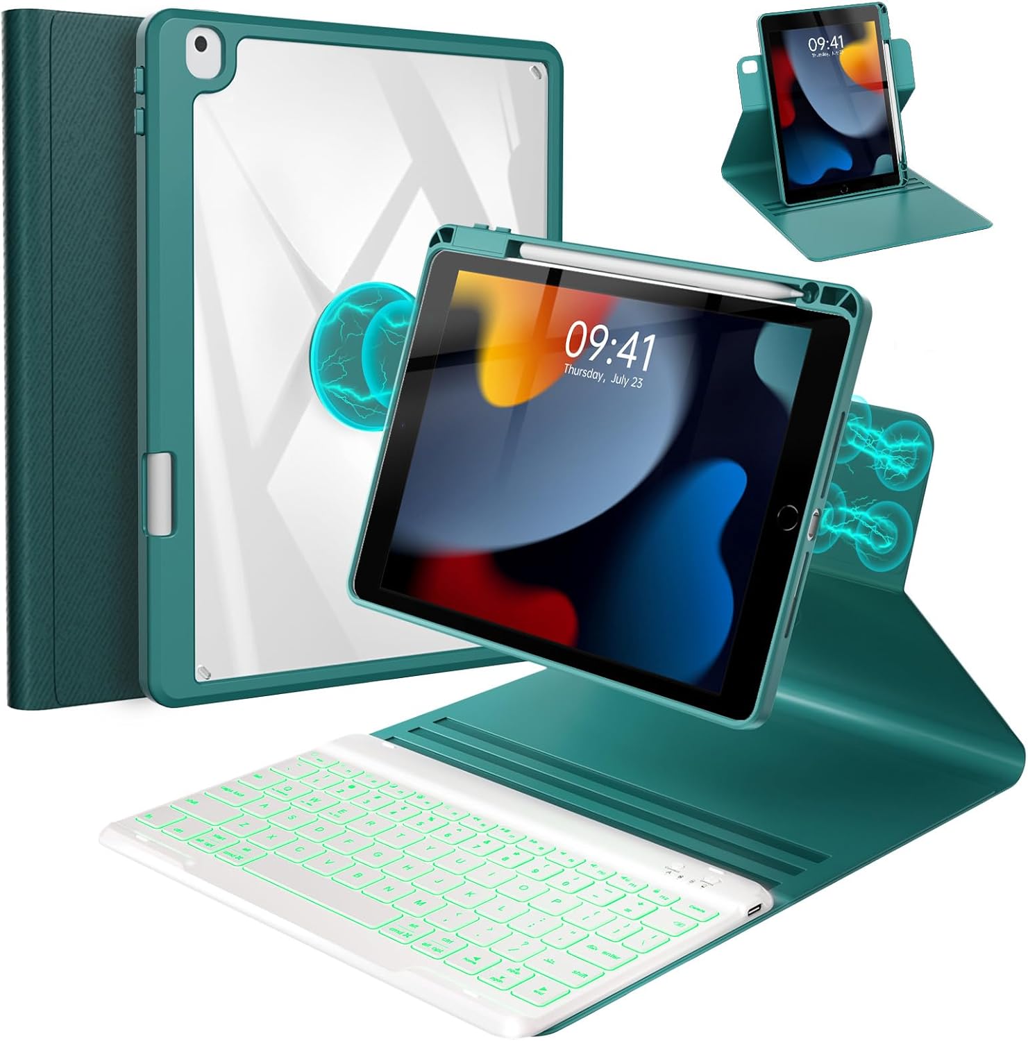 BLUTLOTUS for iPad iPad 9th 8th 7th Generation Case with Keyboard - 360° Rotatable Magnetic Folio Cover 2021/2020/2019, 7 Color Backlit Detachable Keyboard with Pencil Holder - Teal