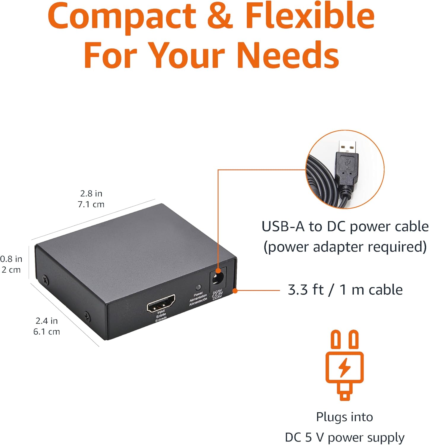 - Includes an HDMI 1-in-2-out splitter, 3.3-foot USB-A to DC power cable (USB power adapter not included), and user manual